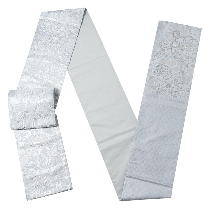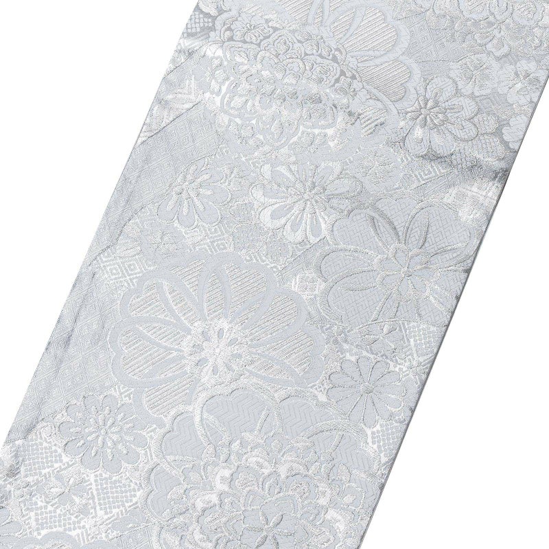 【色柄】白銀の地に菱文様、その上に白、銀、白金で雲取りに吉祥文様や花紋、大きな唐花紋が表現されています。