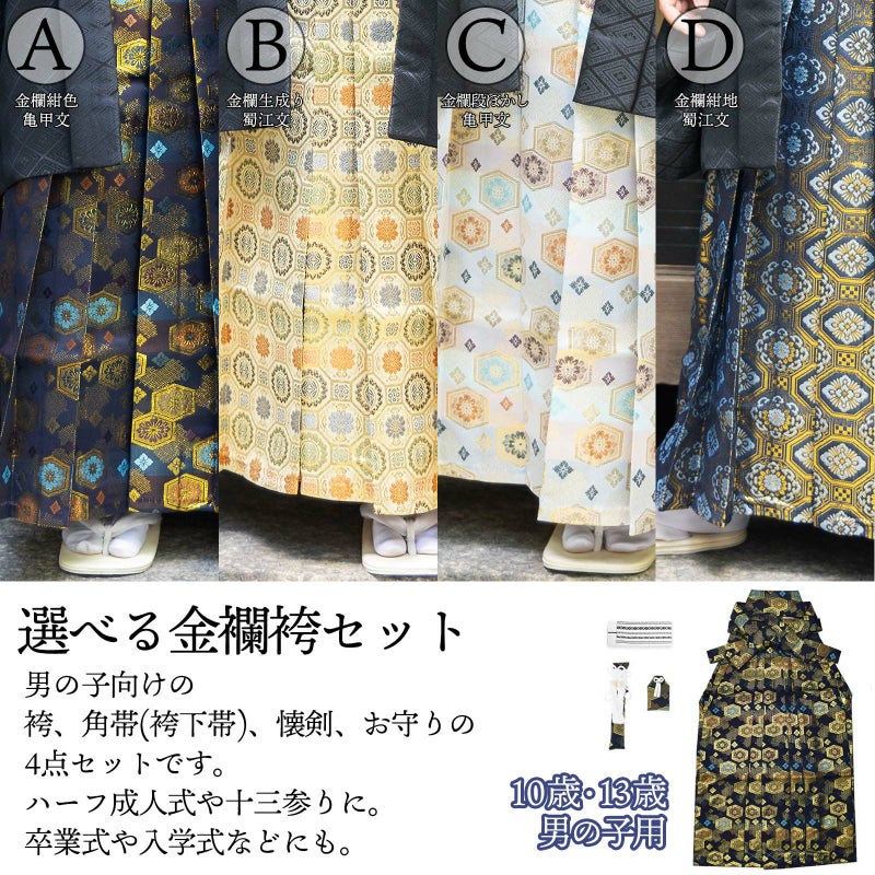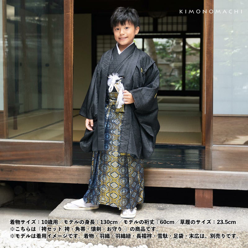 男の子向けの袴、角帯(袴下帯)、懐剣、お守りの4点セットです。