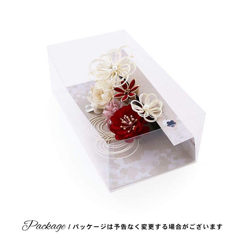2.赤系:深い赤とゴールドの剣つまみのお花1点。白金の水引にパールビーズのお花大1点、小1点。くすみピンクのマム1点。深い赤の花びらにラメのペップのカメリア1点。淡いベージュ系のカメリアと小花1点。白金の水引の輪飾り1点。