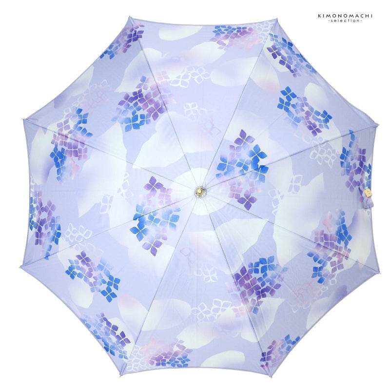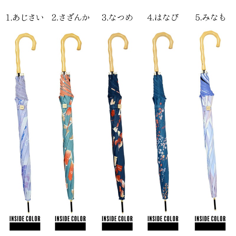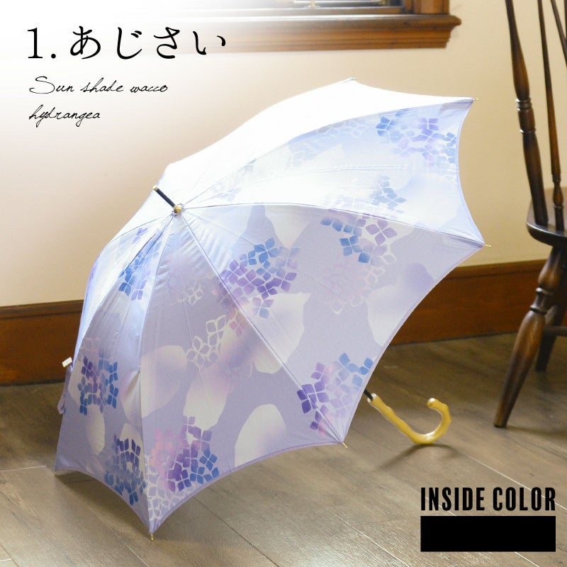1.あじさい:淡い藤色の地に、紫、青の花、淡い藍白の葉で表現されたアジサイ。藤色の縁取り。黒にゴールドの石突き。ナチュラルカラーの木の持ち手にロゴが入っています。