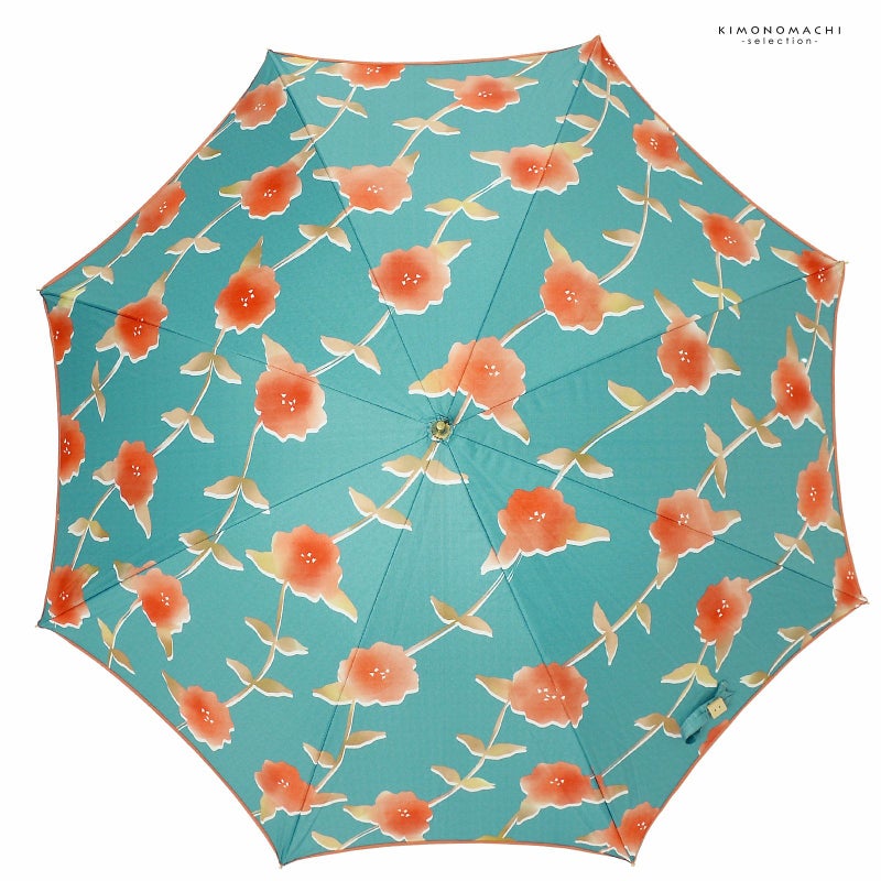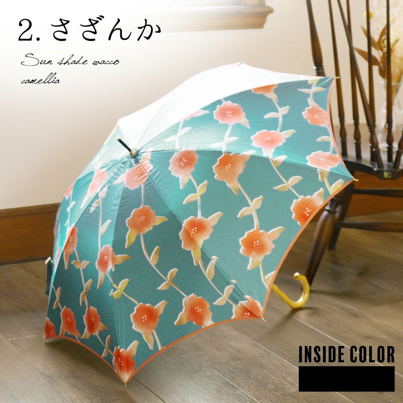 2.さざんか:青磁色の地に柿色のぼかし、黄土色、白の配色の抽象的なサザンカの花の連続模様。サーモンオレンジの縁取り。黒にゴールドの石突き。ナチュラルカラーの木の持ち手にロゴが入っています。