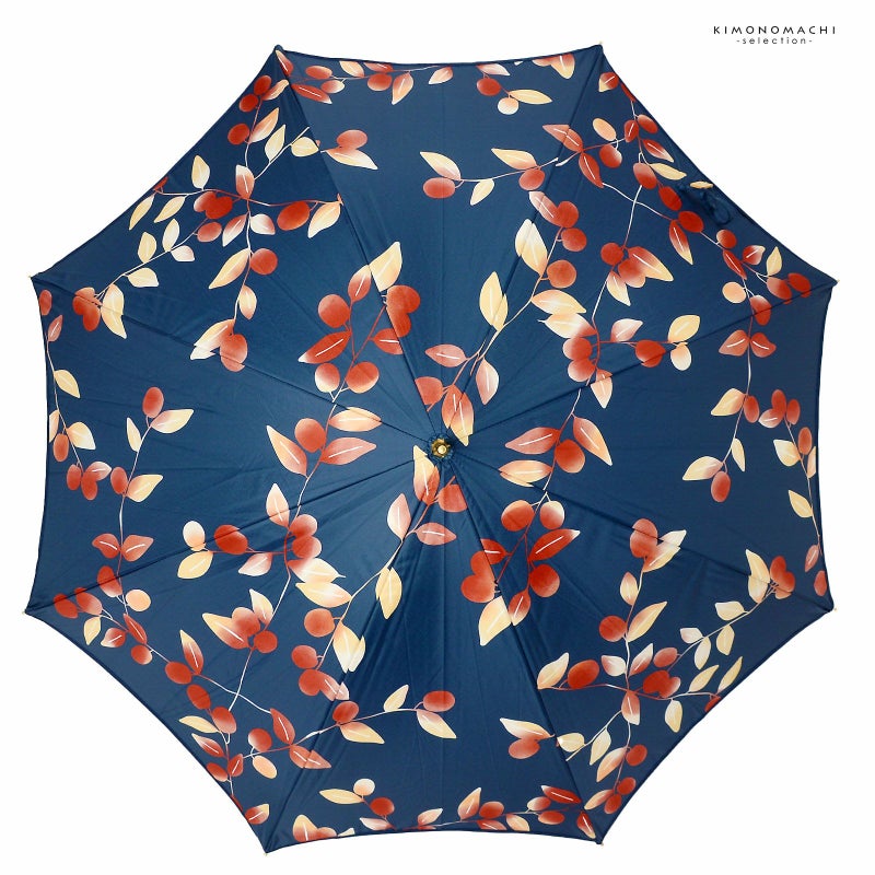 3.なつめ:紺色の地に、赤に薄黄色のぼかし、白の配色の抽象的なナツメの連続模様。黒にゴールドの石突き。ナチュラルカラーの木の持ち手にロゴが入っています。