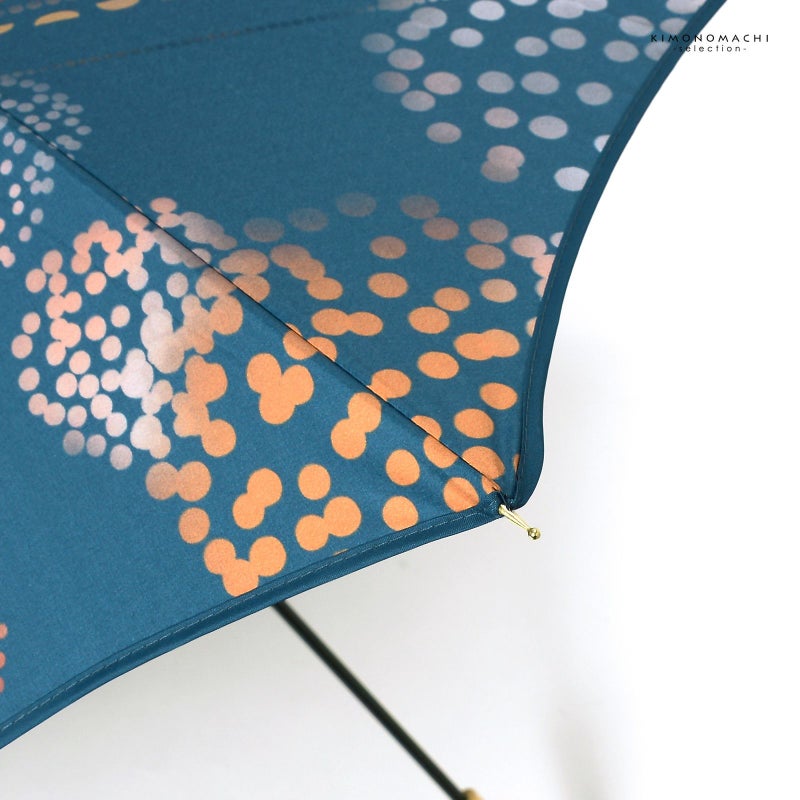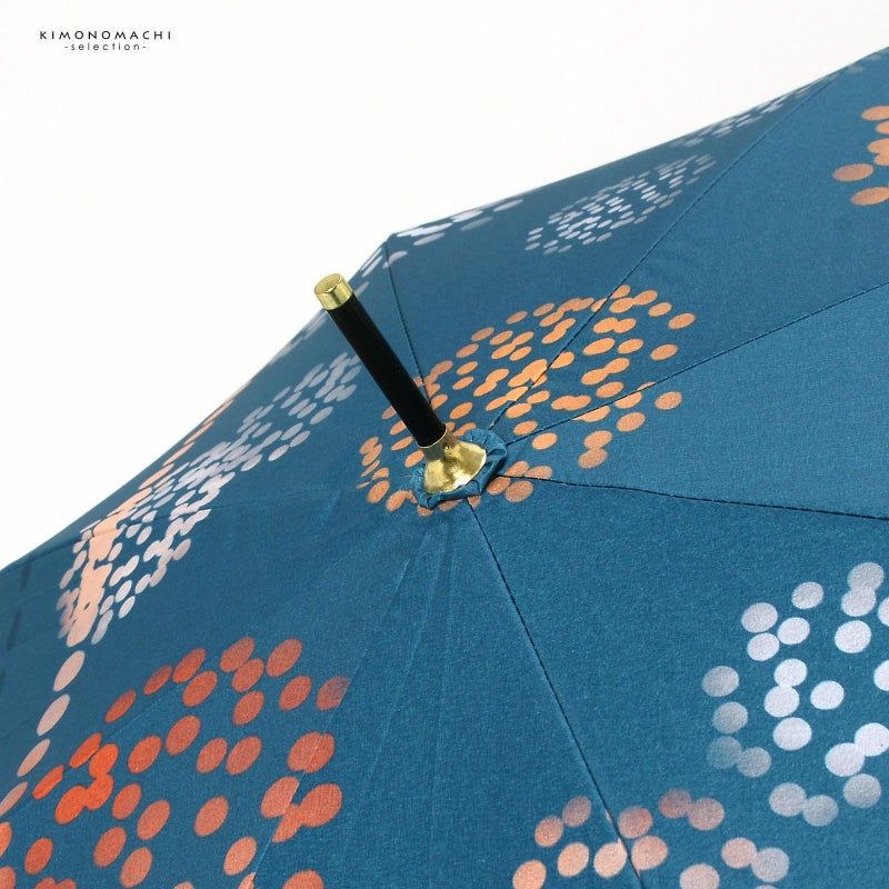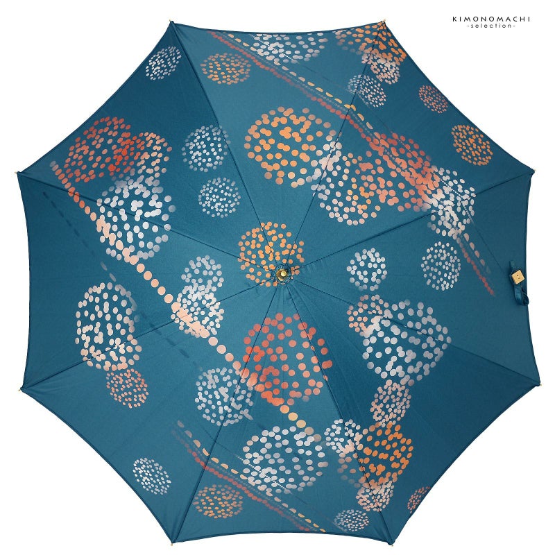 4.はなび:浅い藍色の地にオレンジ、サーモン、白の配色のドットで表現された花火。黒にゴールドの石突き。ナチュラルカラーの木の持ち手にロゴが入っています。