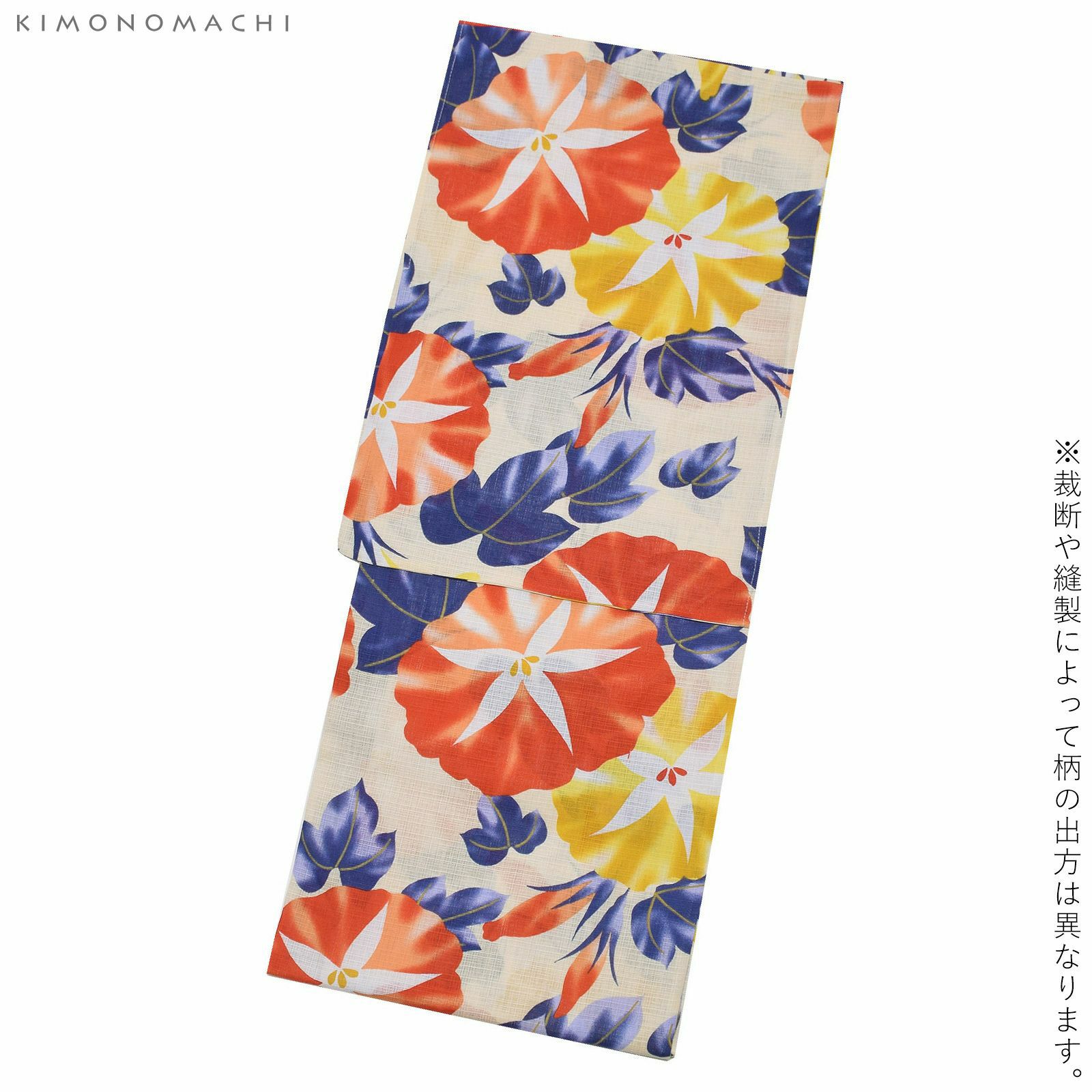 【色柄】生成り地に黄色と朱赤の大きな朝顔。葉は紺。