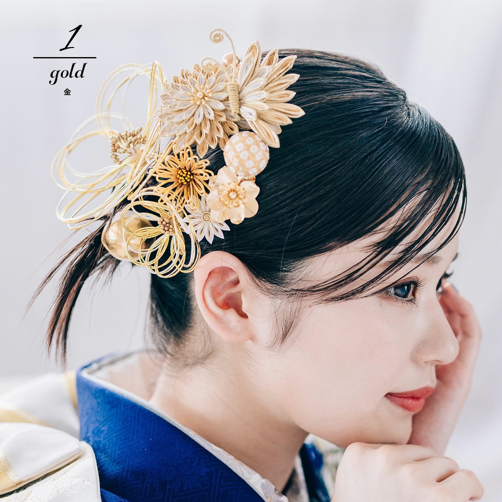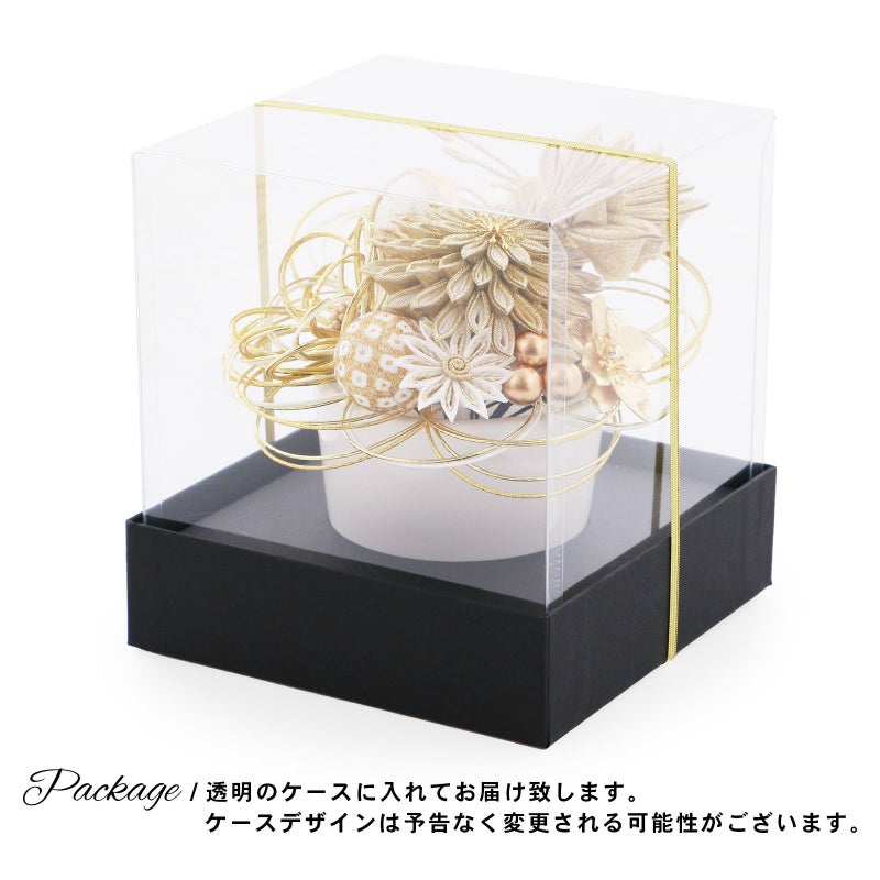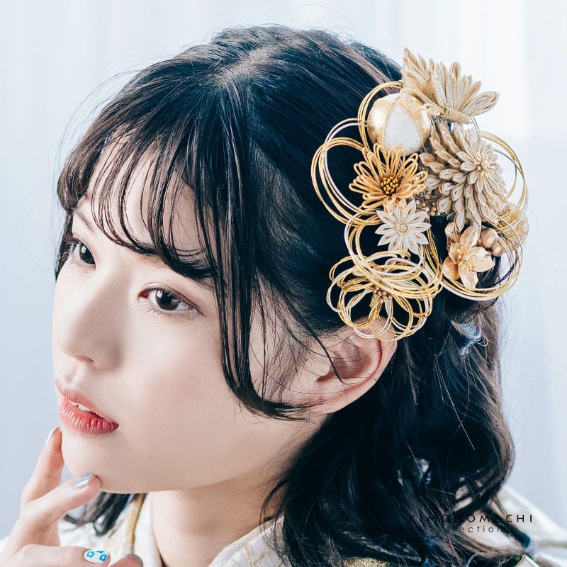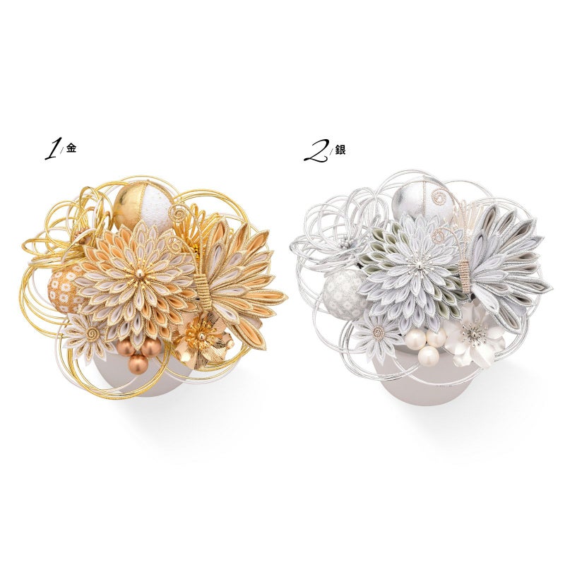1.金:ゴールド、イエローゴールド、白の水引の輪にゴールドのペップのお花・特大1点。同・小1点。白とゴールド、ベージュとゴールドの二重剣つまみのむじな菊1点。白、ベージュ、ゴールドのつまみの蝶1点。白とゴールドラメの剣つまみの小菊1点。ゴールドのメタルフラワー1点。ゴールドと白縮緬を組み合わせた玉飾り1点。白とゴールドの鹿の子の玉飾り1点。イエローゴールドの水引の菊の花1点。ブロンズビーズの実の飾り1点。