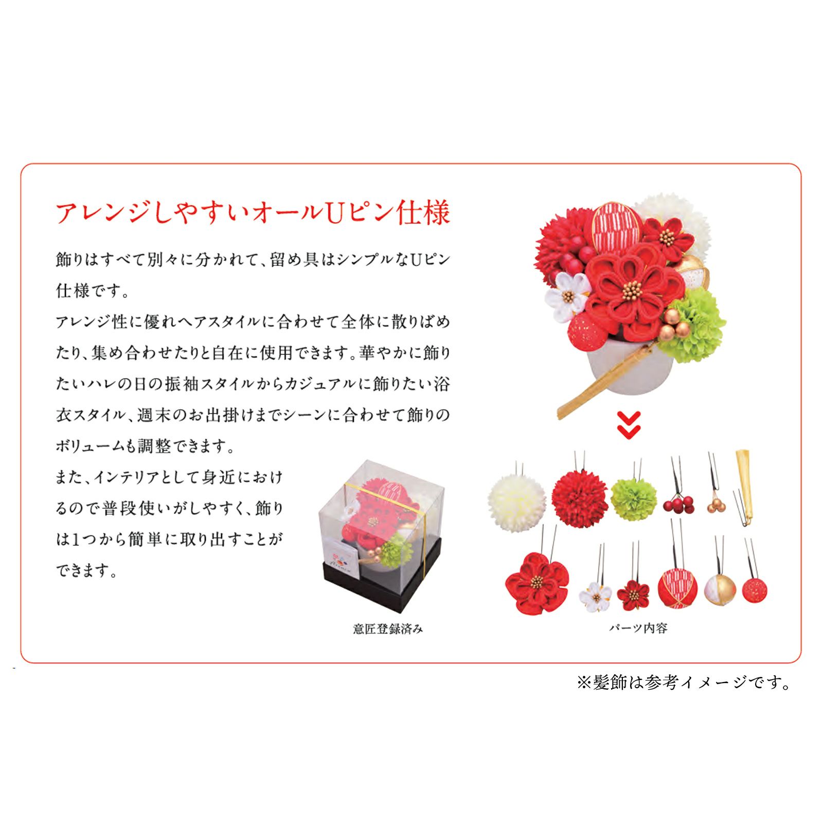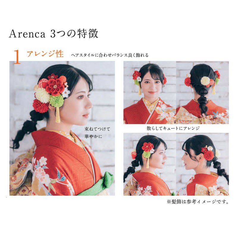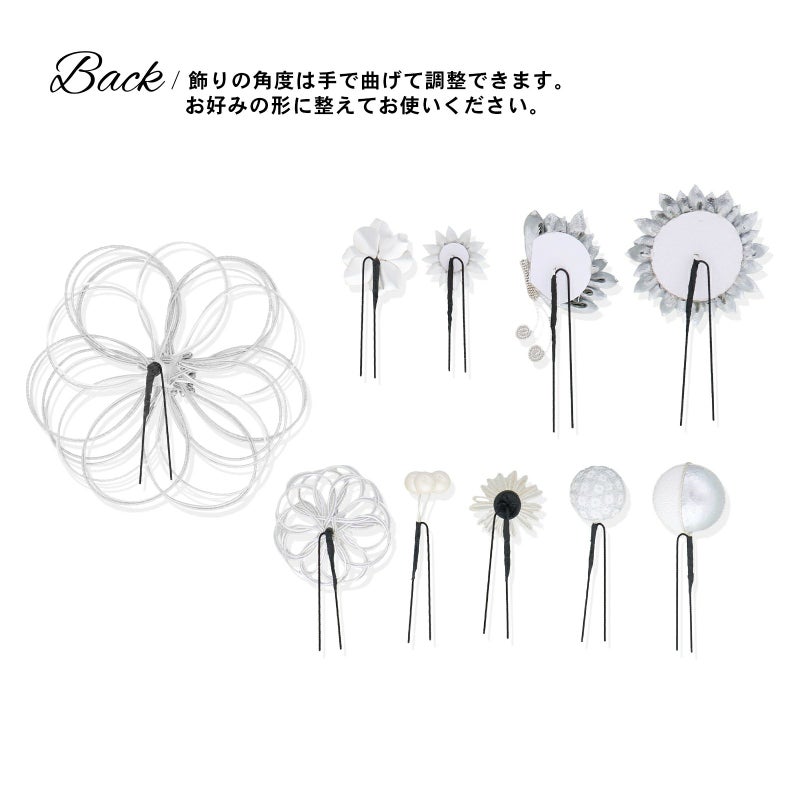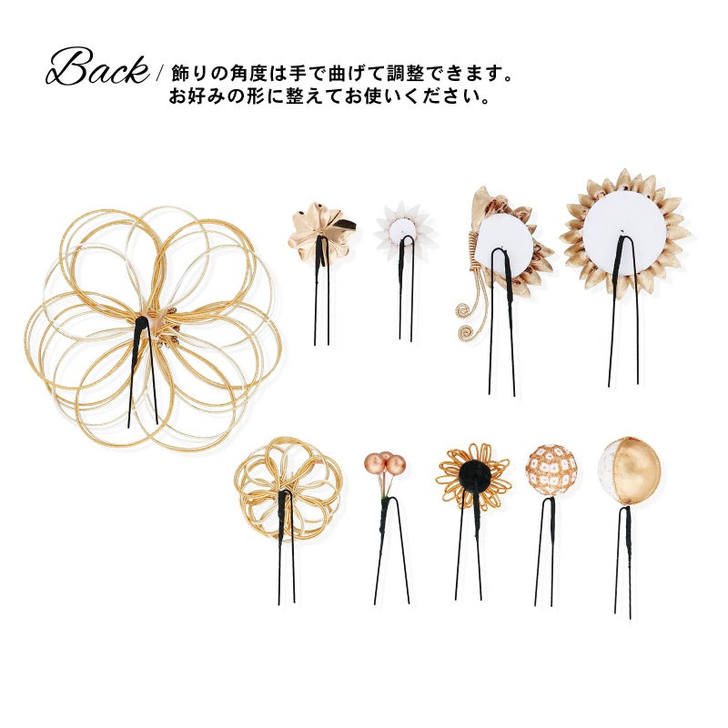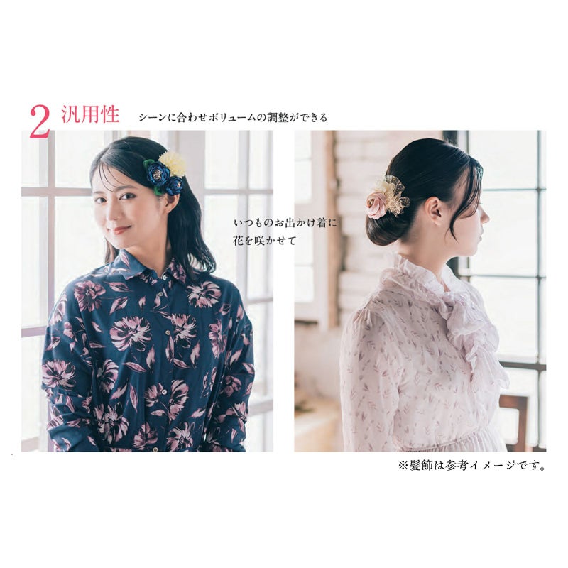 華やかに飾りたいハレの日の振袖スタイルからカジュアルに飾りたい浴衣スタイル、週末のお出掛けまでシーンに合わせて飾りのボリュームも調整できます。