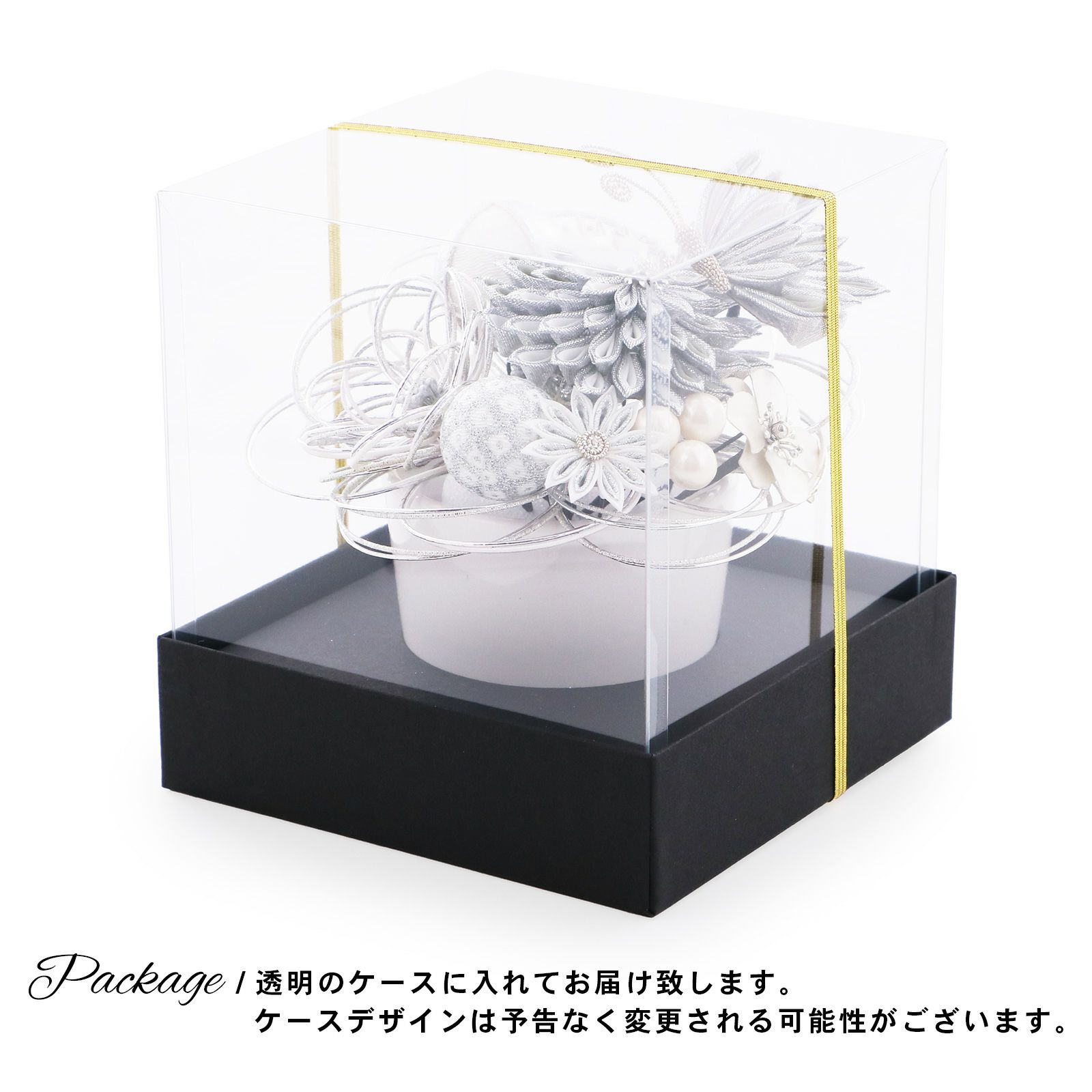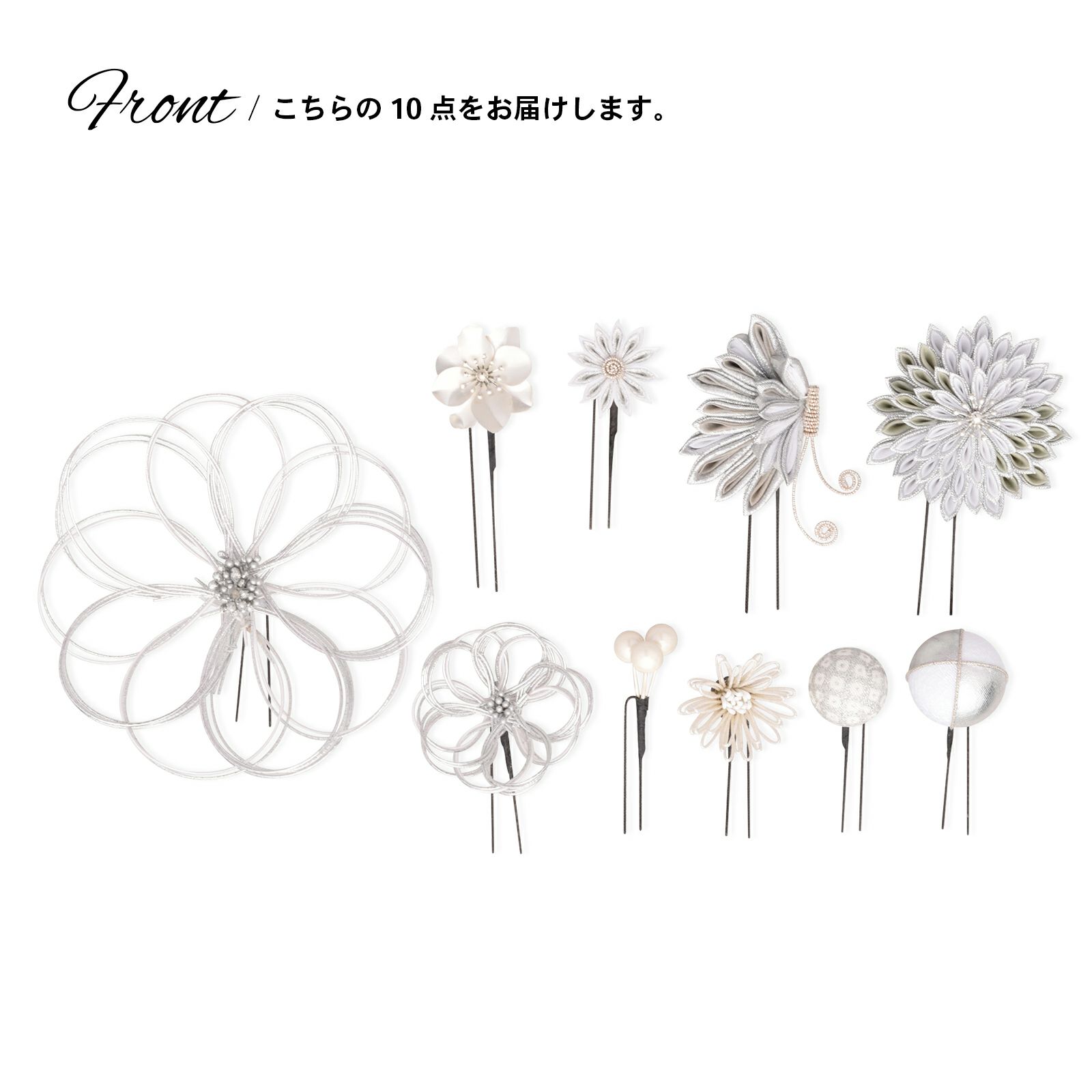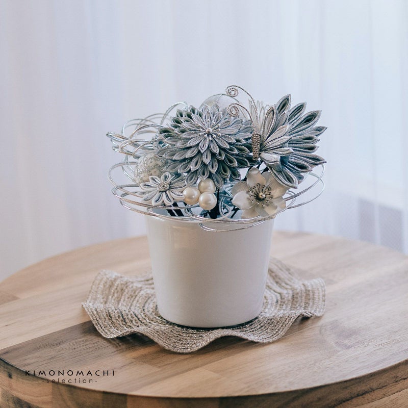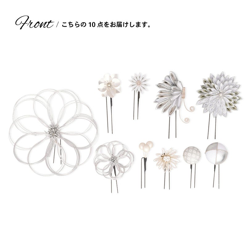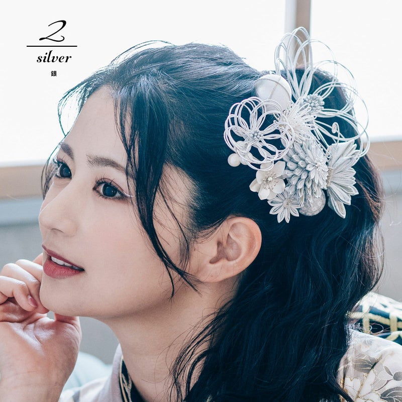 2.銀:シルバー、ホワイトラメシルバー、白の水引の輪にシルバーのペップのお花・特大1点。同・小1点。白とシルバー、グレーとシルバーの二重剣つまみのむじな菊1点。白、グレー、シルバーのつまみの蝶1点。白とシルバーラメの剣つまみの小菊1点。シルバーのメタルフラワー1点。シルバーと白縮緬を組み合わせた玉飾り1点。白とシルバーの鹿の子の玉飾り1点。ホワイトラメの水引の菊の花1点。ホワイトビーズの実の飾り1点。