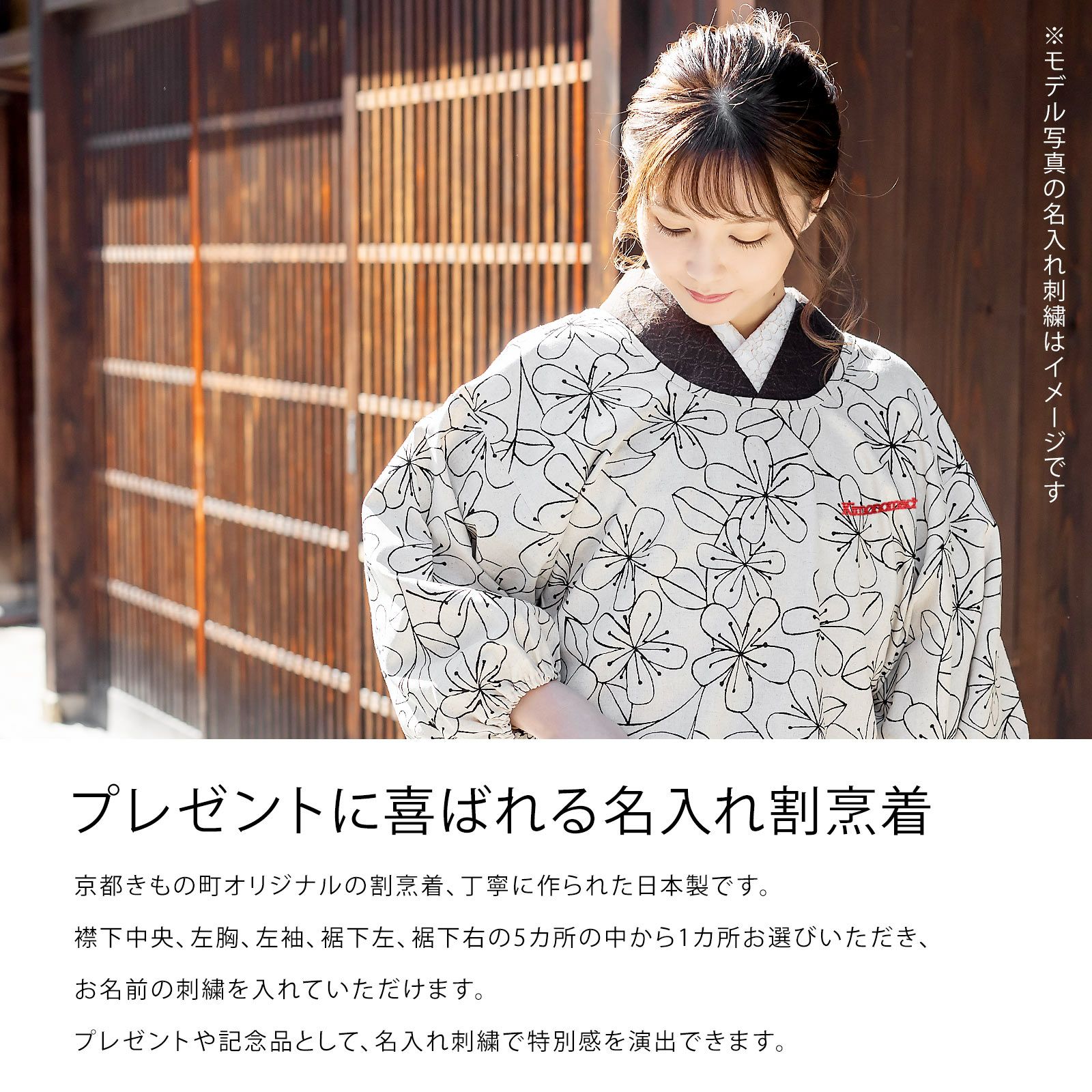襟下中央、左胸、左袖、裾下左、裾下右の5カ所の中から1カ所お選びいただき、お名前の刺繍を入れていただけます。