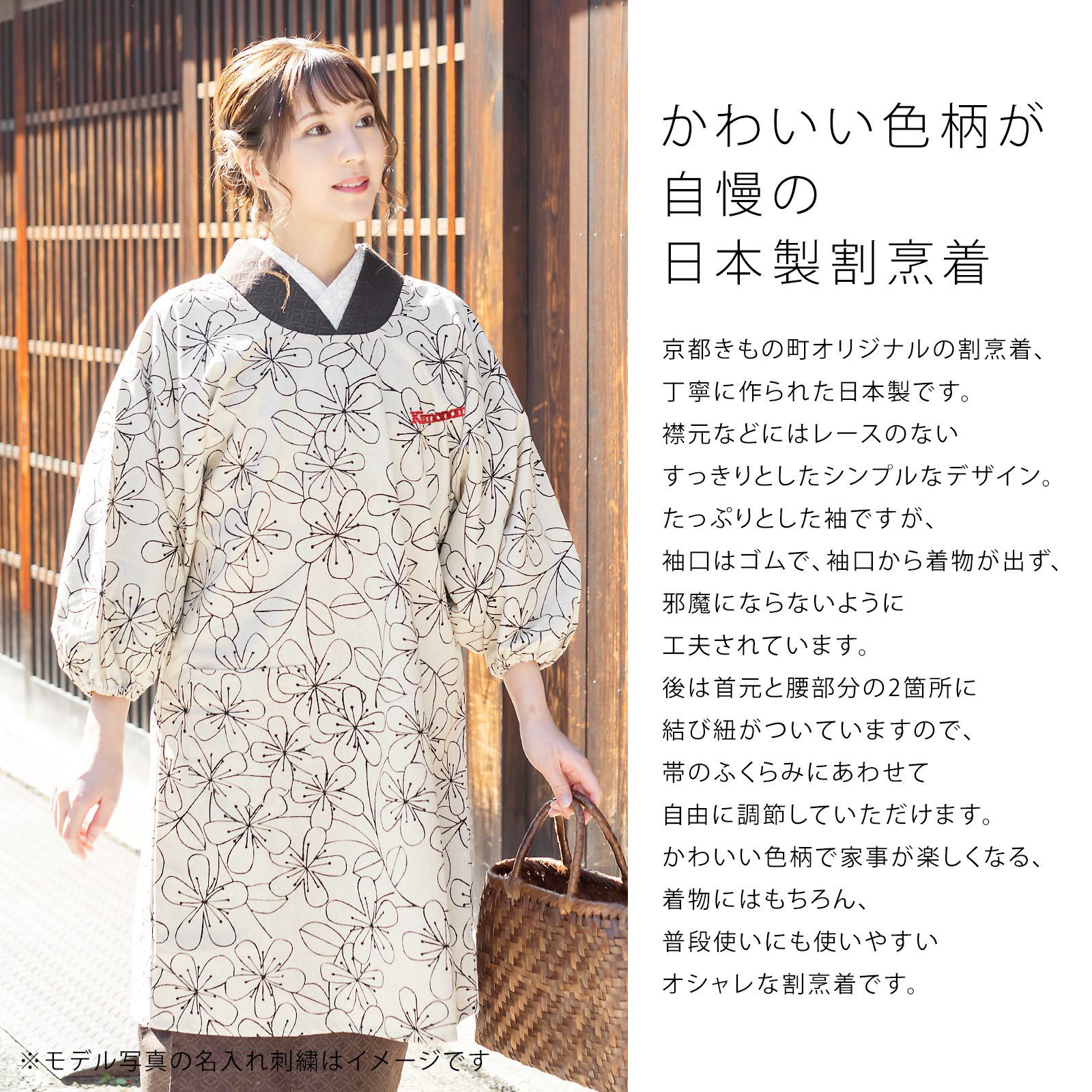 京都きもの町オリジナルの割烹着、丁寧に作られた日本製です。