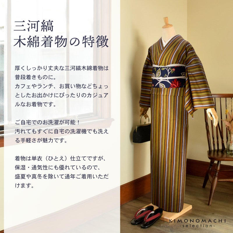 着物は単衣(ひとえ)仕立てですが、三河木綿は保湿・通気性にも優れているので、盛夏や真冬を除いて通年ご着用いただけます。
