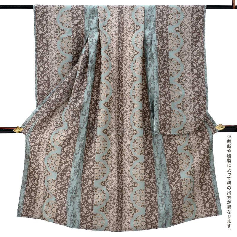 【色柄】細かな地模様のある生地。全体的にグレイッシュな色合いの浅い水色、ベージュ、薄茶色の縦縞。その中にやや鮮やかな水色、薄水色の挿し色が入った大きな華紋や、桃唐草、ペイズリー風の草花など様々な唐草文様。ミントチョコのような現代的な色使いとオリエンタルな文様がお洒落なデザインです。裏地は白。