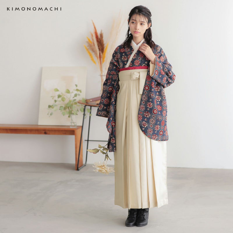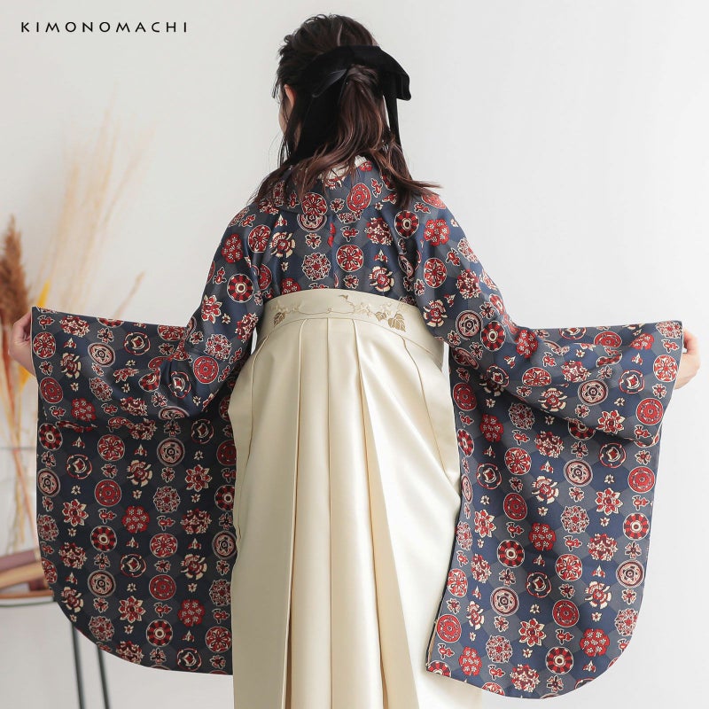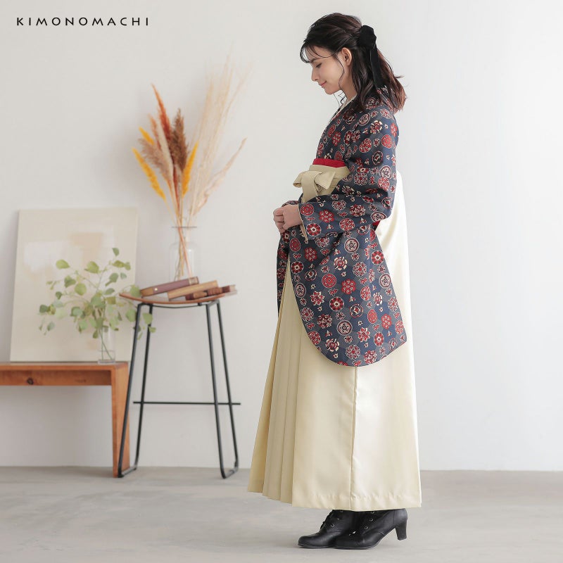 袴はバックスタイルに刺繍のワンポイント。行灯袴(あんどんはかま)で中仕切りのないスカートタイプ。草履はもちろん、ブーツを合わせたモダンな着こなしにも。生地はお手入れしやすいポリエステル素材です。