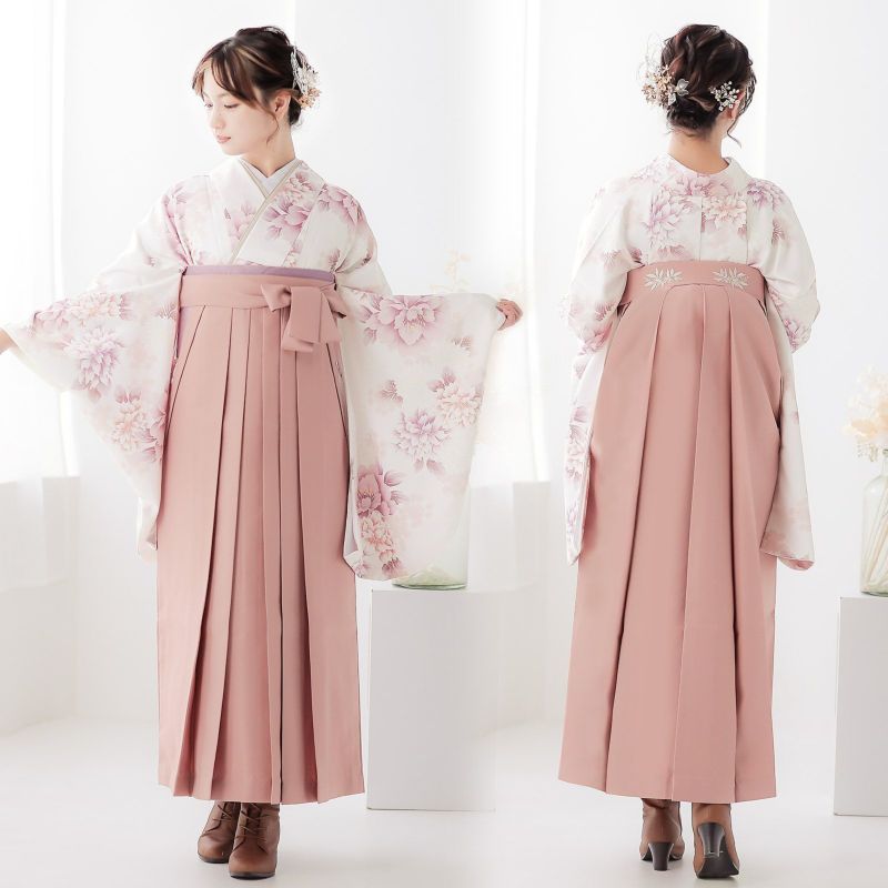 二尺袖着物は袴と合わせて着付けやすい短丈タイプです。袴はバックスタイルに刺繍のワンポイント。行灯袴(あんどんはかま)で中仕切りのないスカートタイプ。