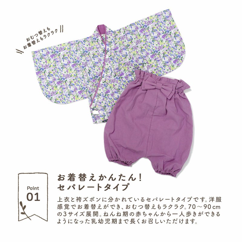 上衣と袴ズボンに分かれているセパレートタイプです。洋服感覚でお着替えができ、おむつ替えもラクラク。