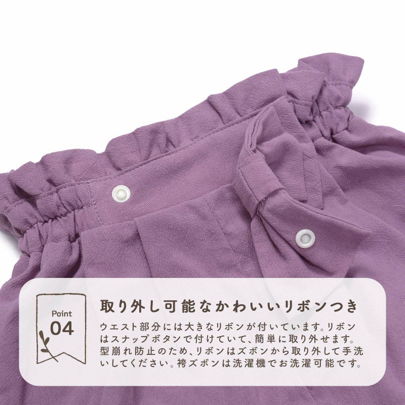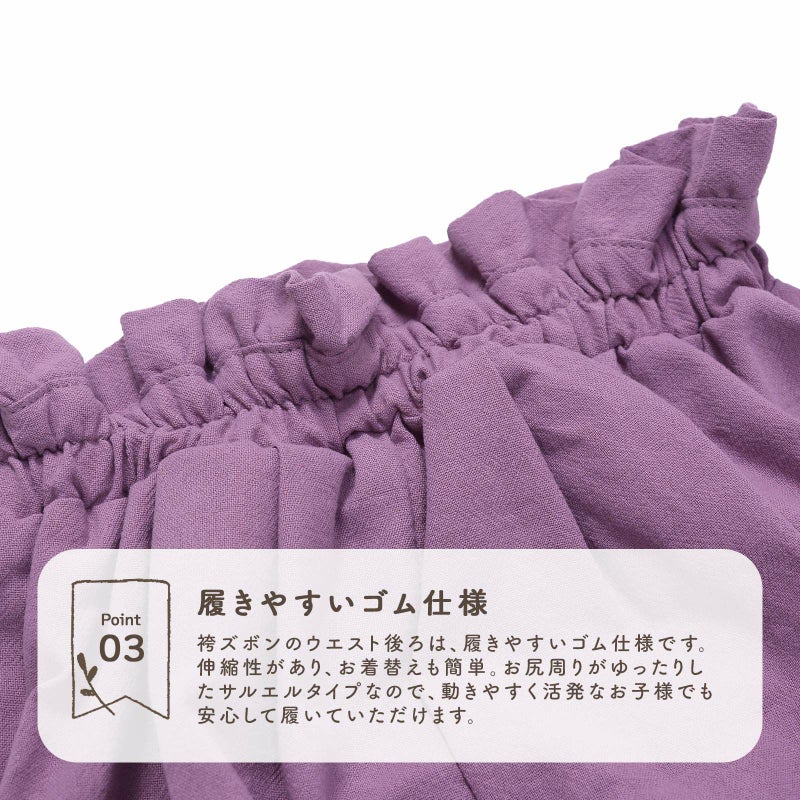お尻周りがゆったりしたサルエルタイプなので、動きやすく活発なお子様でも安心して履いていただけます。