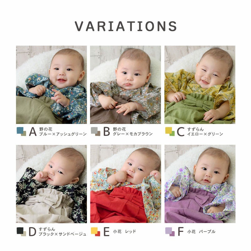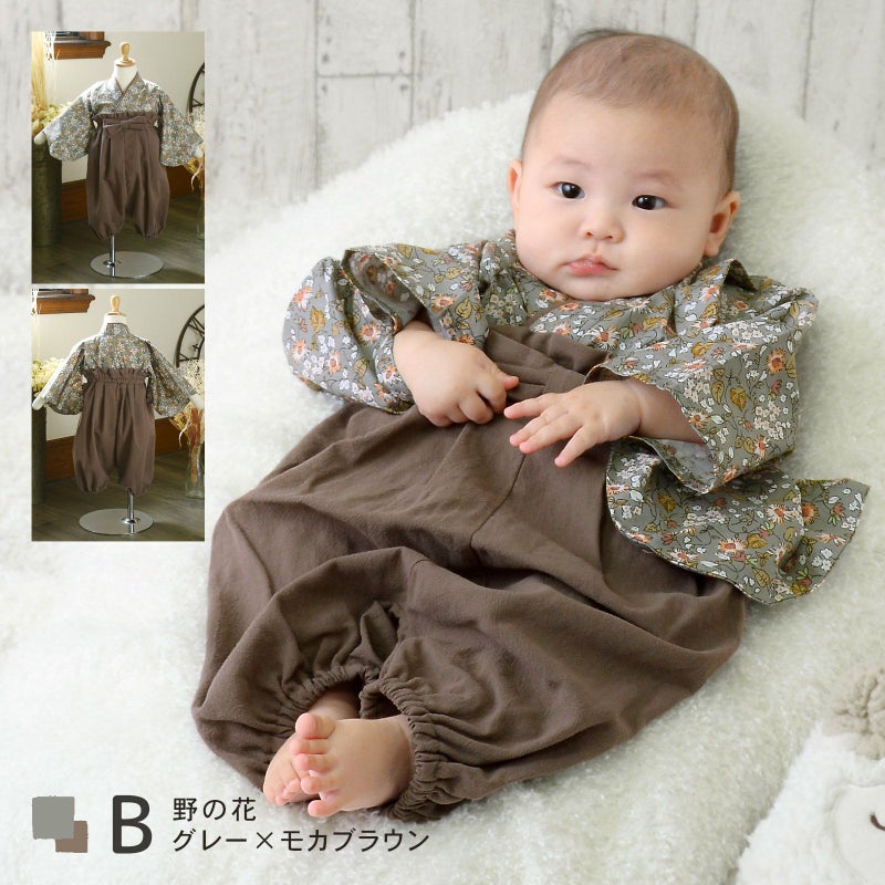 家族で写真を撮ったりお出かけしたりが楽しくなる、特別な日の装いにふさわしい赤ちゃん用の袴セットです。70~90cmの3サイズをご用意。