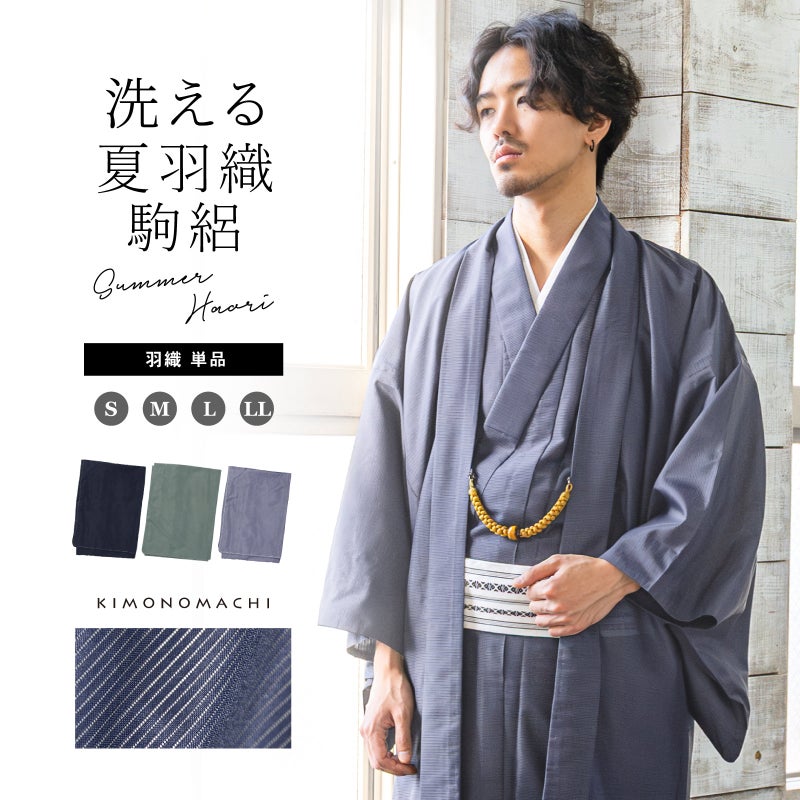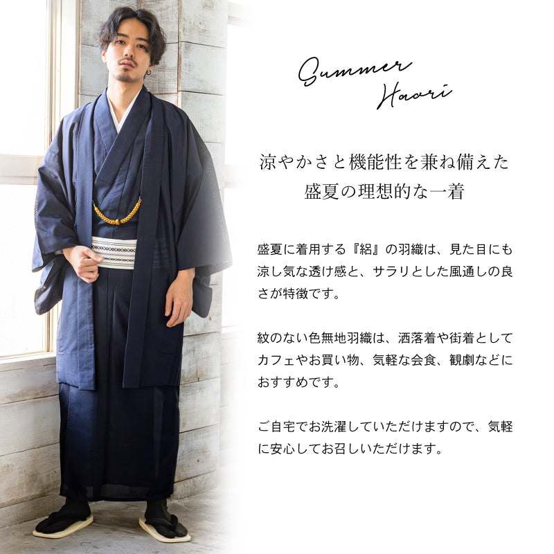 一枚羽織るだけで、夏の和装が決まる。 メンズ 夏羽織 色無地 絽(駒絽)洗える単衣羽織「濃藍・千草色・藤鼠」S/M/L/LL ポリエステル 単衣 涼しい 男性 男羽織 夏祭り 花火 茶道 お盆 KIMONOMACHI オリジナル【メール便不可】