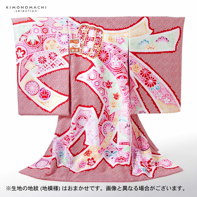【色柄】紗綾形の地模様のある生地を、白と赤の疋田で染め上げた地。背から広がる束ね熨斗は赤や濃いピンク、薄緑色、水色、藤色、淡い橙色などで、菊や楓、橘の花紋や青海波に亀甲の吉祥文様が表現されています。熨斗の結び目には金駒刺繍。絞りのやわらかな表現と豊かな色彩が愛らしく華やかな印象です。襦袢は薄ピンクの鶴に亀甲の地紋。振りは赤の鶴に亀甲の地紋。