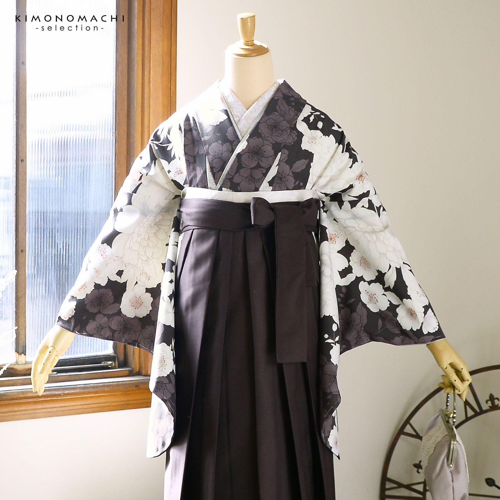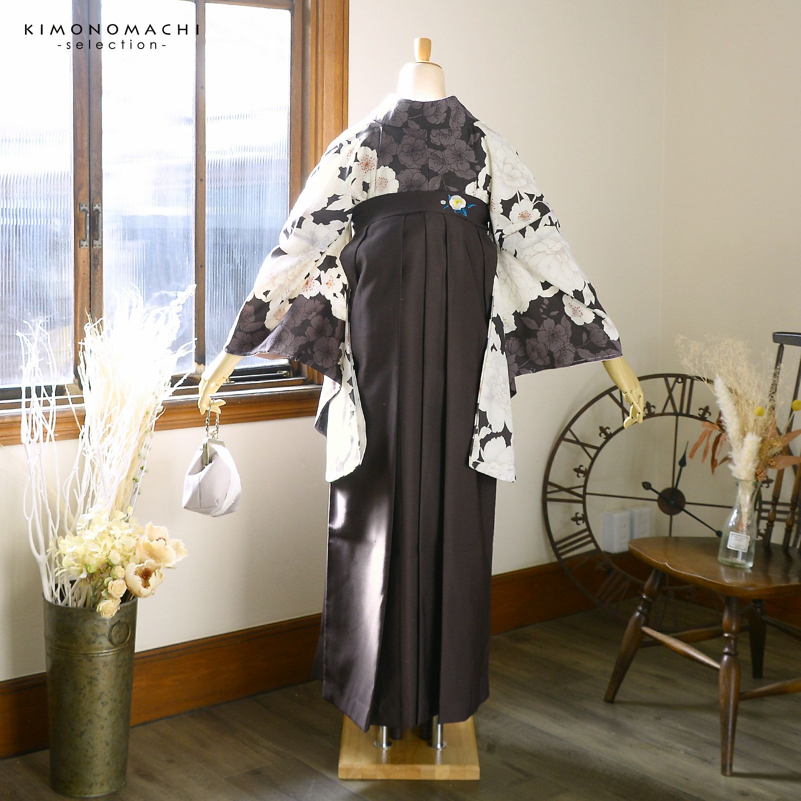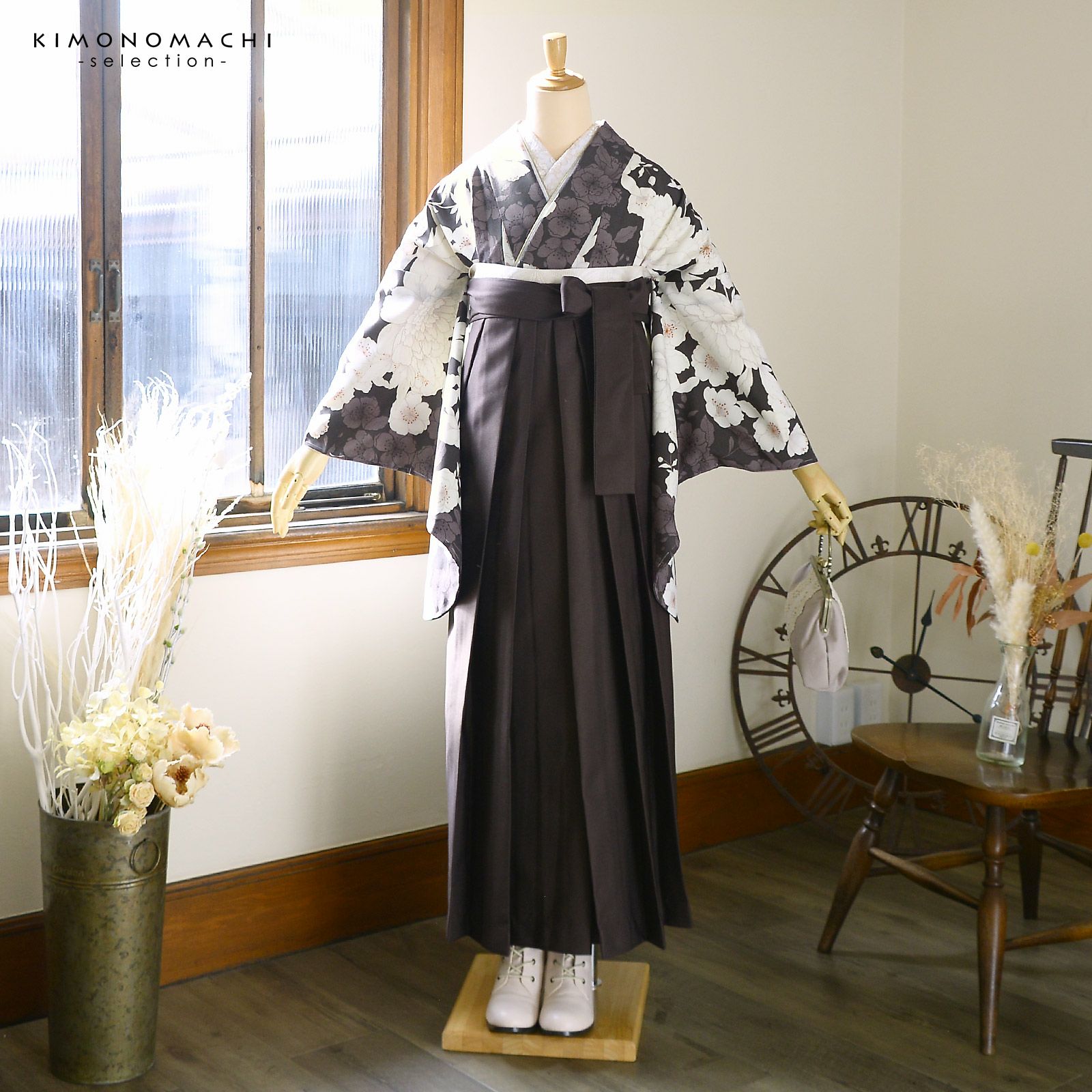 袴 セット 卒業式 女性 4点セット「二尺袖:牡丹に桜 こげ茶×ココア+刺繍袴:アンティークブラウン+袴下帯:白+襦袢」卒業式 女性 レディース お仕立て上がり 袴セット 二尺袖着物セット 着物 二尺着物 袴【メール便不可】