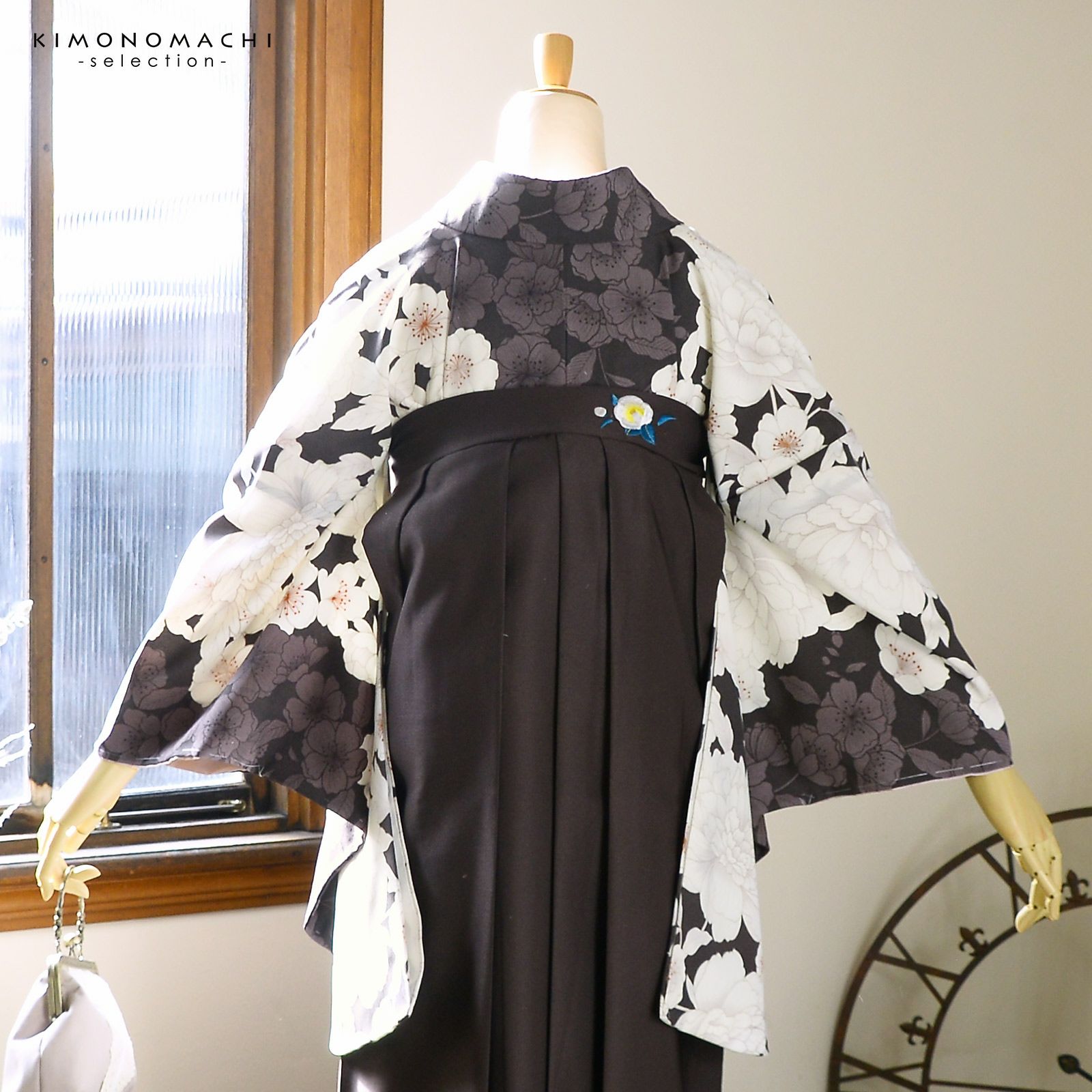 5. (卒業式応援10%OFFCOUPON1/22迄)袴 セット 卒業式 女性 4点セット「二尺袖:牡丹に桜 こげ茶×ココア+刺繍袴:アンティークブラウン+袴下帯:白+襦袢」卒業式 女性 レディース お仕立て上がり 袴セット 二尺袖着物セット 着物 二尺着物 袴【メール便不可】