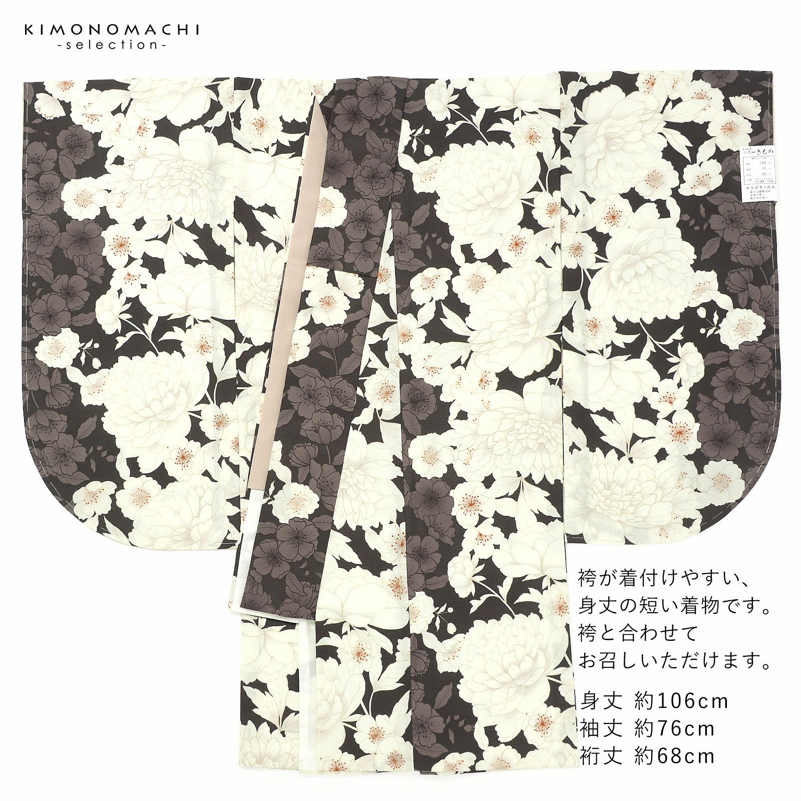 卒業式に 二尺袖袴セット 卒業式 袴 レディース (卒業式応援10%OFFCOUPON1/22迄)袴 セット 卒業式 女性 4点セット「二尺袖:牡丹に桜 こげ茶×ココア+刺繍袴:アンティークブラウン+袴下帯:白+襦袢」卒業式 女性 レディース お仕立て上がり 袴セット 二尺袖着物セット 着物 二尺着物 袴【メール便不可】