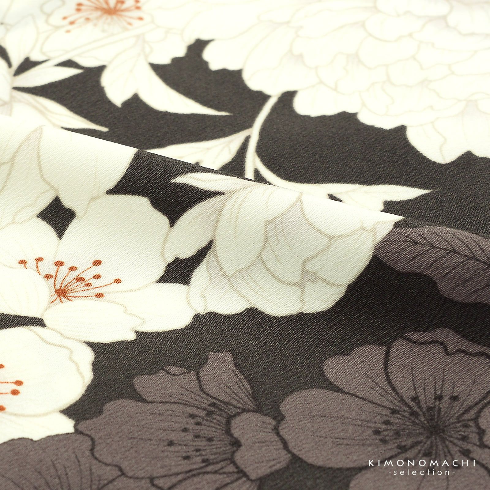 二尺袖着物:深いこげ茶の地に、ココア色の八重桜。その上にベージュの線で表現されたアイボリーの牡丹の花に八重桜。ポイントに淡い灰紫のぼかし、紅色の蕊。