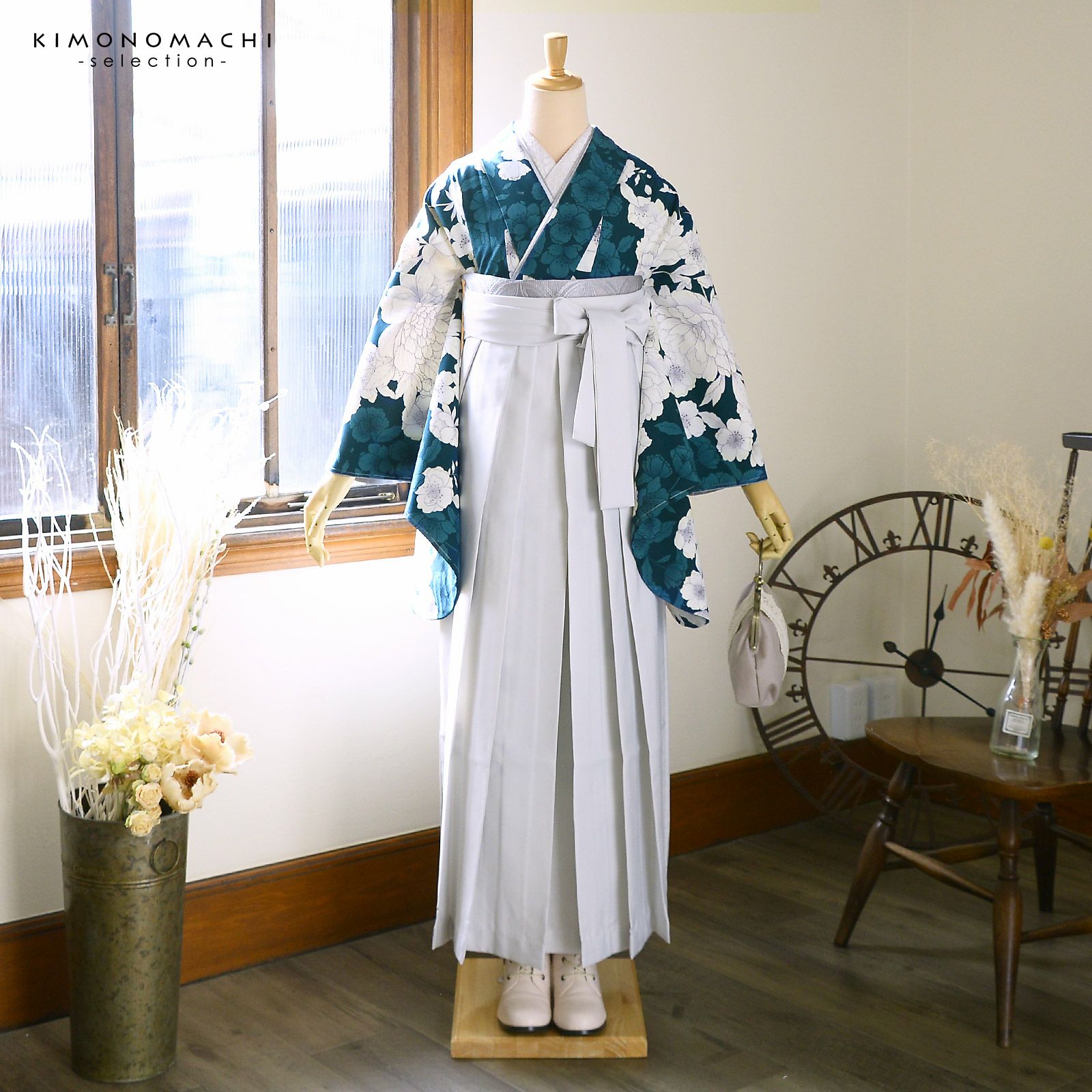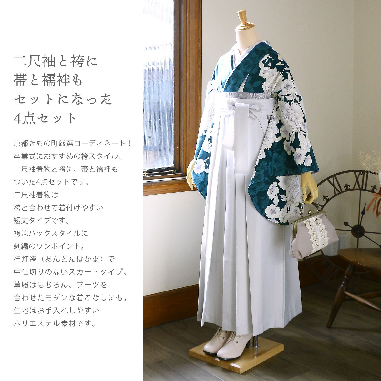 袴 セット 卒業式 女性 4点セット「二尺袖:牡丹に桜 深青緑+刺繍袴:アイスグレー+袴下帯:シルバーグレー+襦袢」卒業式 女性 レディース お仕立て上がり 袴セット 二尺袖着物セット 着物 二尺着物 袴【メール便不可】