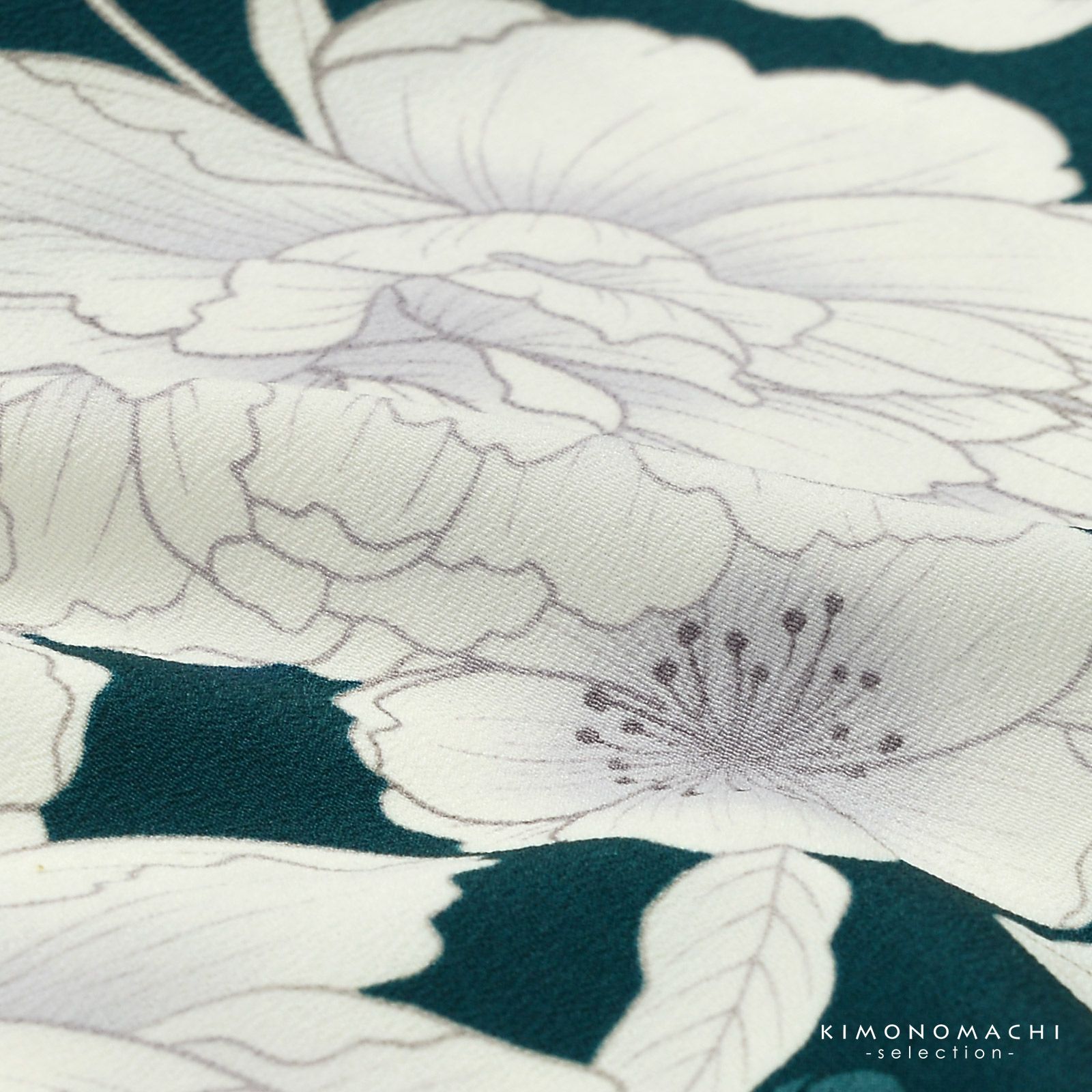 二尺袖着物:深い青緑色の地に、浅葱色の八重桜。その上に藤色の線で表現されたアイボリーの牡丹の花に八重桜。ポイントに淡い藤色のぼかし。