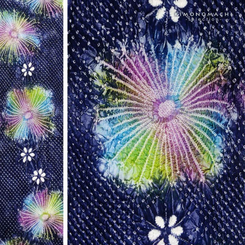 【色柄】濃淡のある紺藍に鹿の子を並べた地。細かな絞りを連ねて表現した花火の周りは紫、黄緑、水色などのグラデーション。白の絞りの小花。