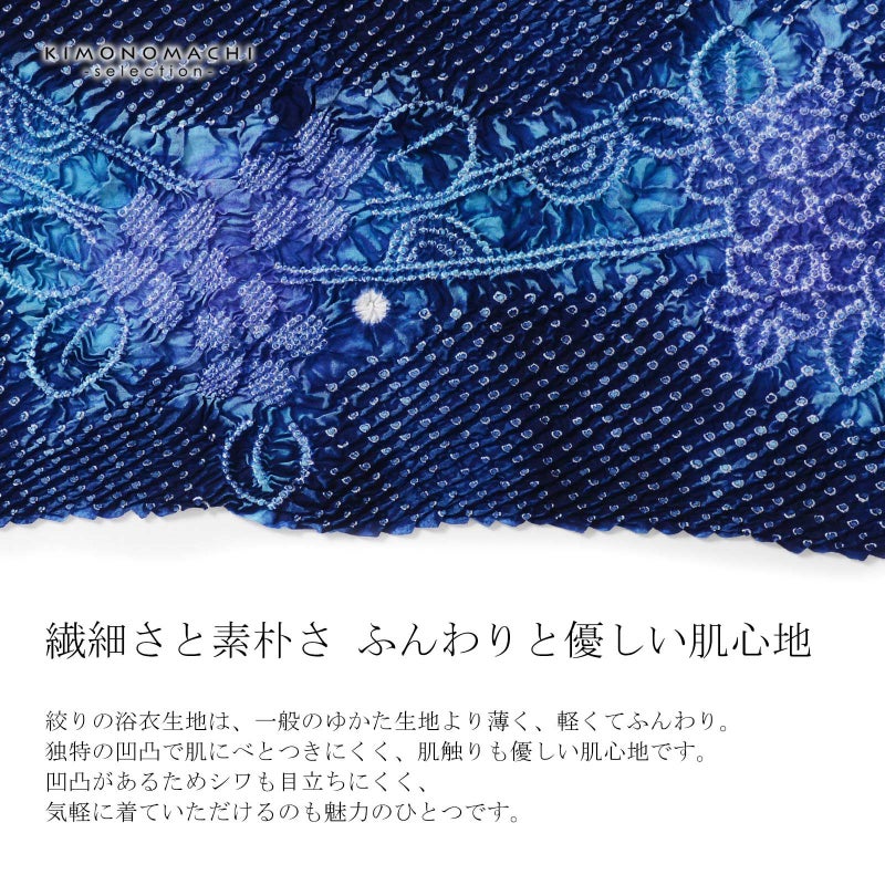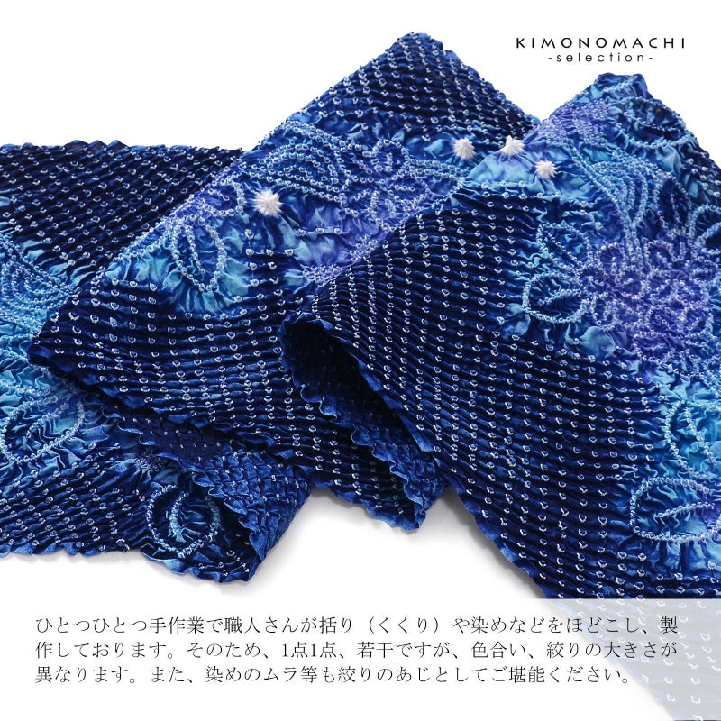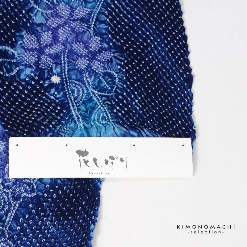 【色柄】濃淡のある紺藍に鹿の子を並べた地。ひと目絞りを連ねて流れるように表現された花蔓、その周りは縹色、お花に紫の挿し色。