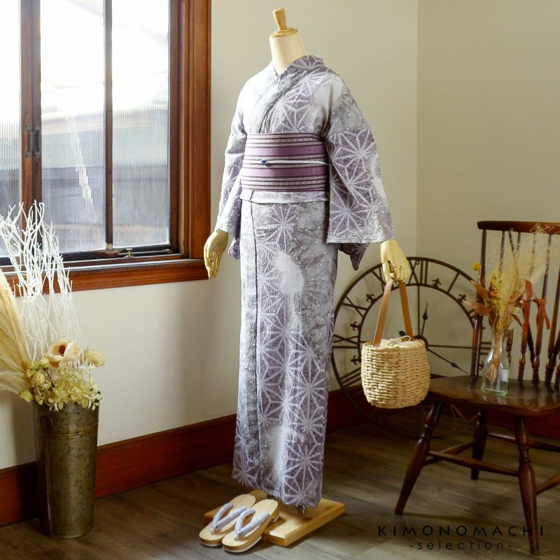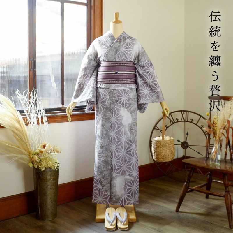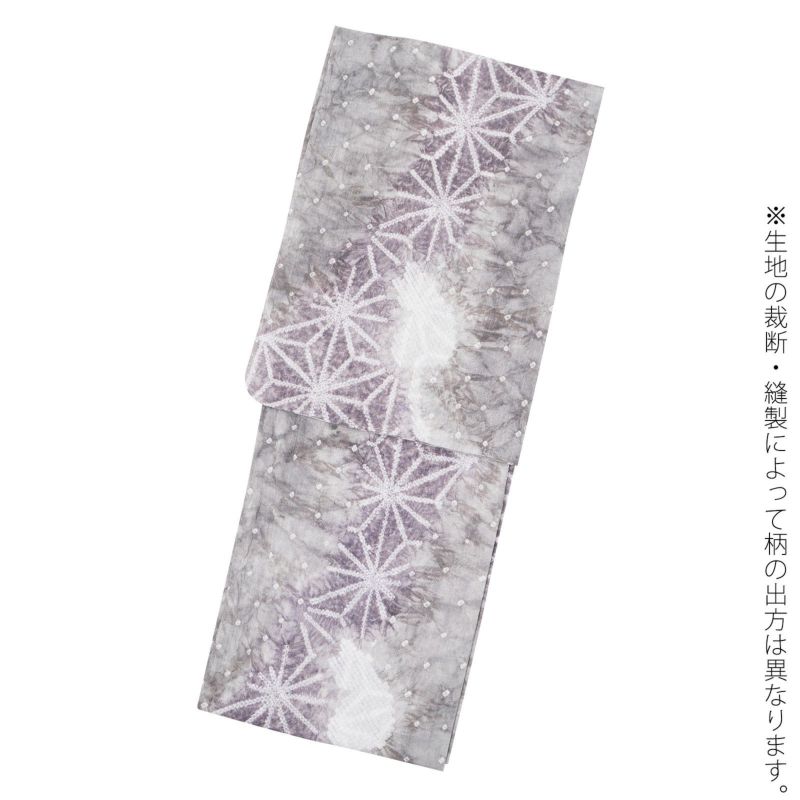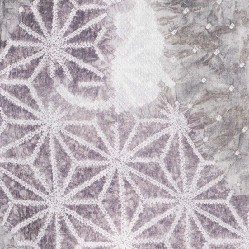 【色柄】濃淡のあるグレーに淡いグレイッシュな紫のぼかし。細かな絞りを連ねて表現された麻の葉に、猫のシルエット。