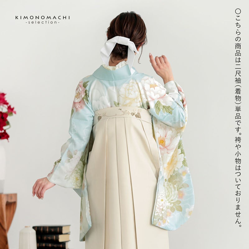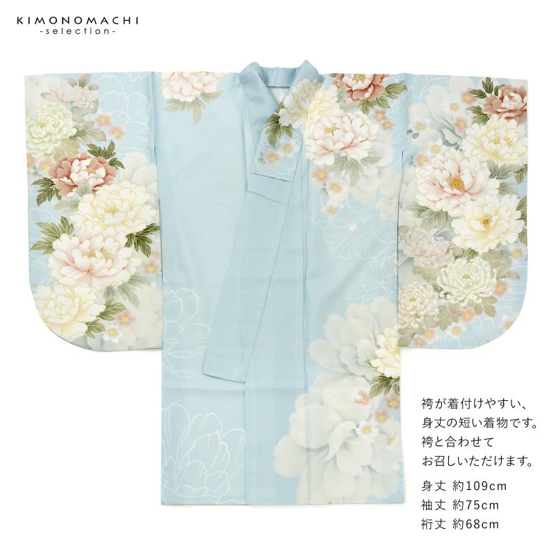 3. 二尺袖着物 単品 絵羽「水色、白緑 牡丹に菊」Fサイズ お仕立て上がり 短丈 ショート丈 レディース 洗える着物 二尺袖 着物 袴に合わせて 卒業式 謝恩会【メール便不可】