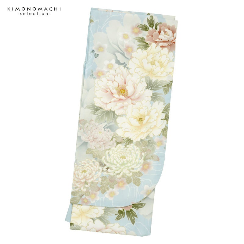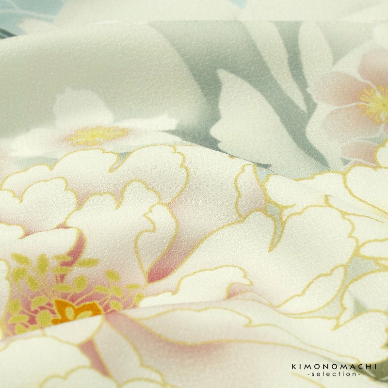 【色柄】グレイッシュな淡い水色地にごく淡い白緑色の大輪の牡丹。その上に、白に淡い黄色ぼかしやくすんだ淡い赤紫の牡丹の花、抹茶色の葉。大きな菊の花に桜の小花。華やかな文様が縫い目をまたいで繋がる絵羽になっています。