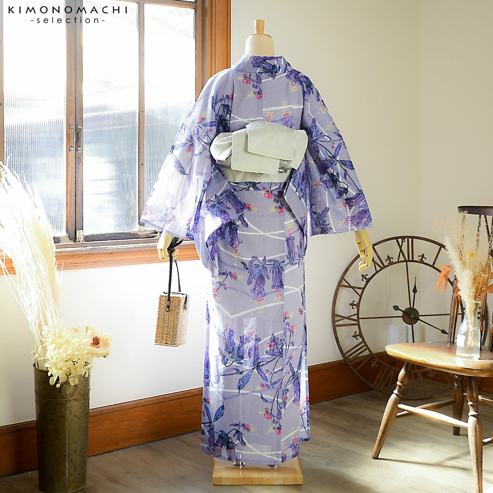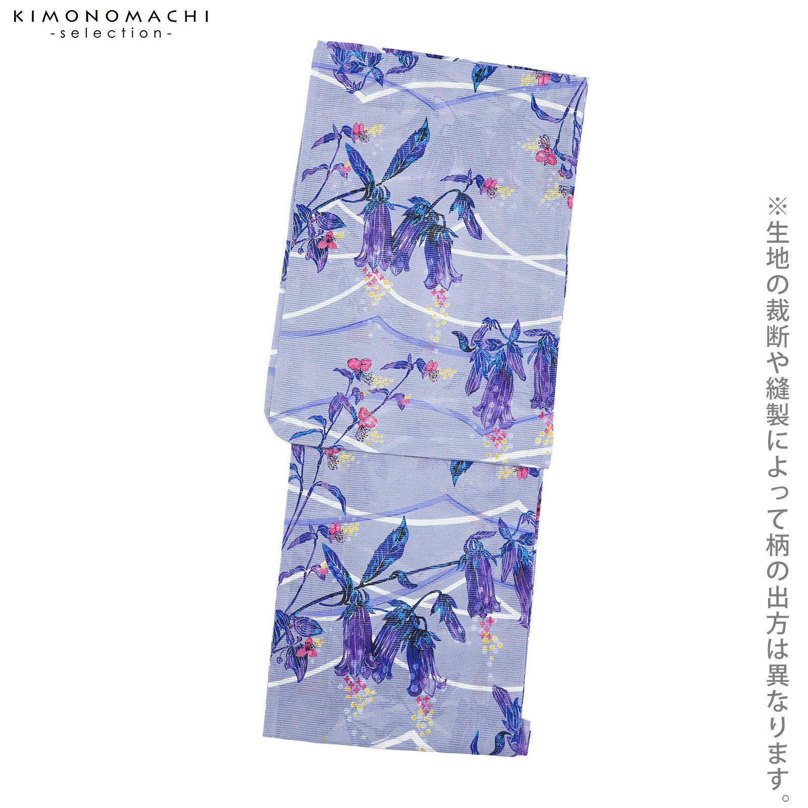 【色柄】グレイッシュな淡い青藤色の地に白と青紫で表現された霞や山道のような曲線。その上に青紫に紺、紫色、マゼンタピンクに黄色のホタルブクロや露草。花の周りに散らされたドットが夢を見ているかのような雰囲気です。