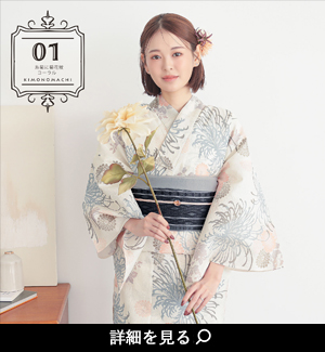 アイボリーの地に、グレーと青紫のぼかしの入った大きな糸菊の花。紺や浅葱色、ブルーグレーの菊の花紋にグレーの葉。糸菊の繊細な華やかさとシックな配色が大人っぽい雰囲気です。