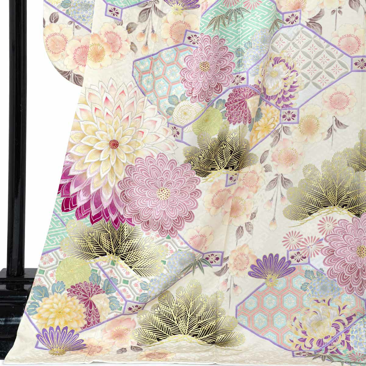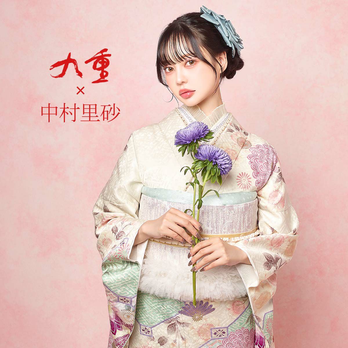 人気ブランド「九重×中村里砂」のお振袖。クリーム地に蜀江文様と菊が描かれた上品なデザインで、柔らかなトーンと藤色のアクセントが洗練された印象を演出。成人式や前撮りにふさわしい、格調高い一着です。また、モデル画像と同じ小物「重ね衿・帯揚げ・帯締め」がセットになります。