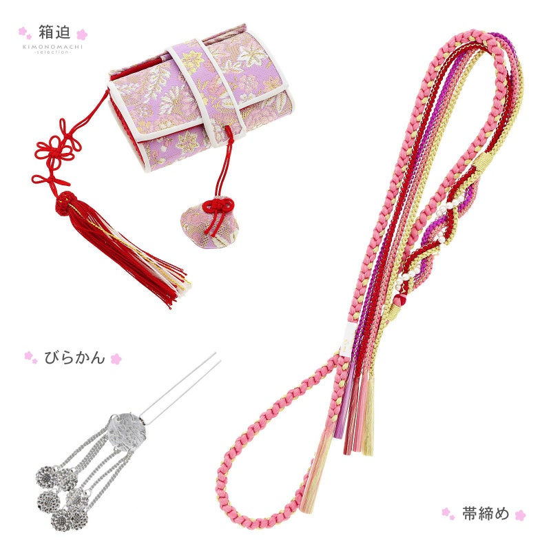 七歳の七五三(四つ身着物)の着付けに必要なものが揃ったフルセットです。お洒落で女の子らしい雰囲気。