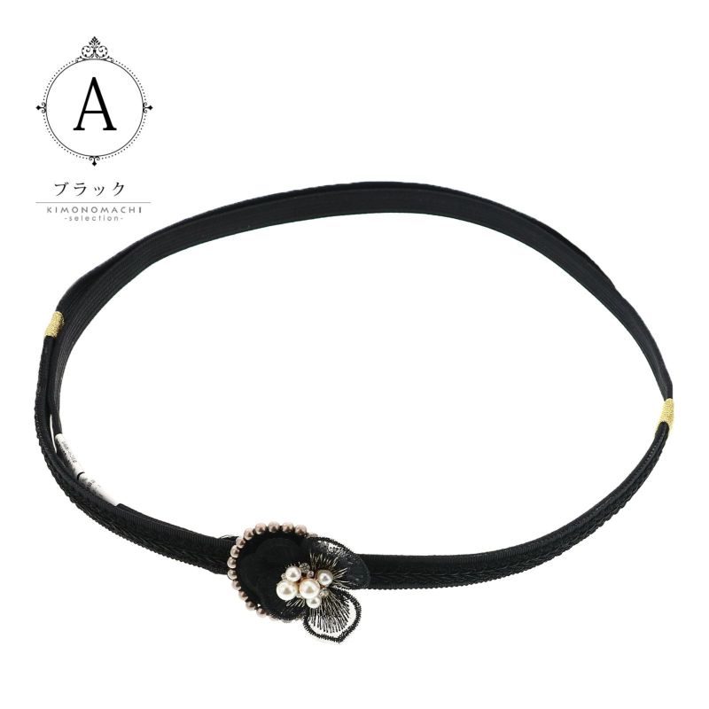 1.ブラック:黒の帯締め、中央に黒のブレードリボン、両端にゴールドの留め紐。ブロンズビーズをあしらった黒のベロアのくるみパーツ、レースの花びらにラインストーンやパールビーズを合わせたビオラのお花。