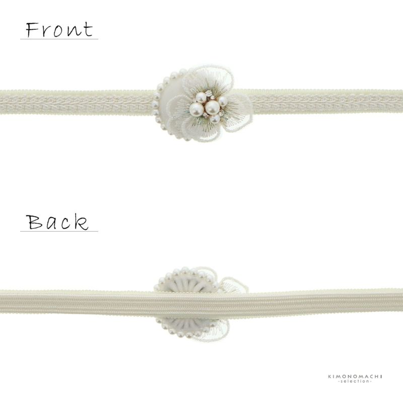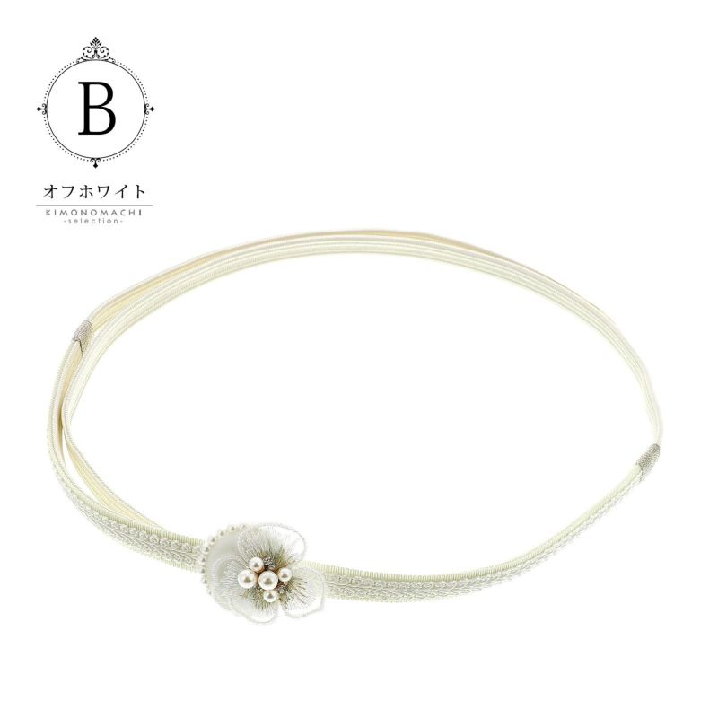 2.オフホワイト:オフホワイトの帯締め、中央に白のブレードリボン、両端にシルバーの留め紐。パールビーズをあしらった白のベロアのくるみパーツ、レースの花びらにラインストーンやパールビーズを合わせたビオラのお花。