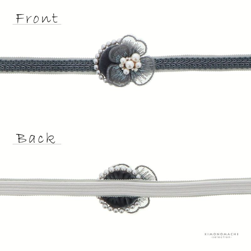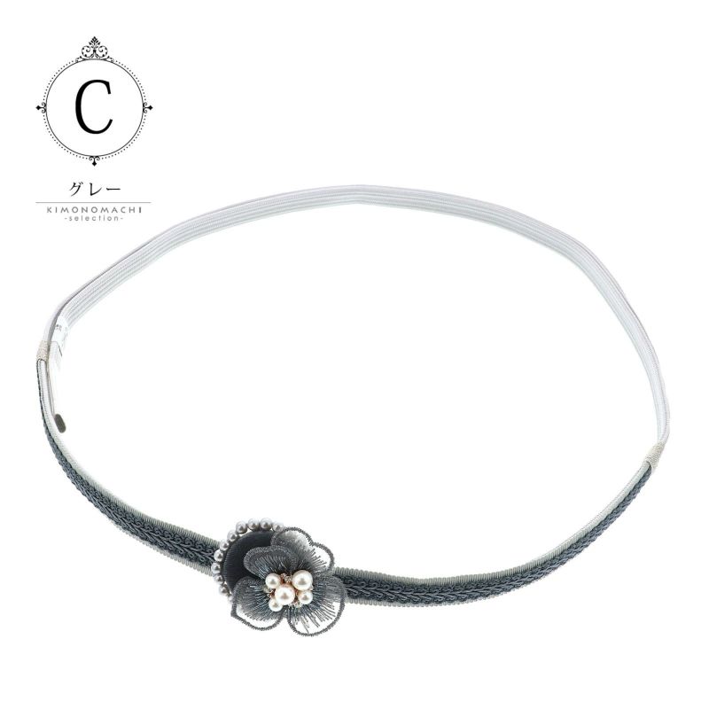 3.グレー:アイスグレーの帯締め、中央にグレーのブレードリボン、両端にシルバーの留め紐。パールビーズをあしらったグレーのベロアのくるみパーツ、レースの花びらにラインストーンやパールビーズを合わせたビオラのお花。