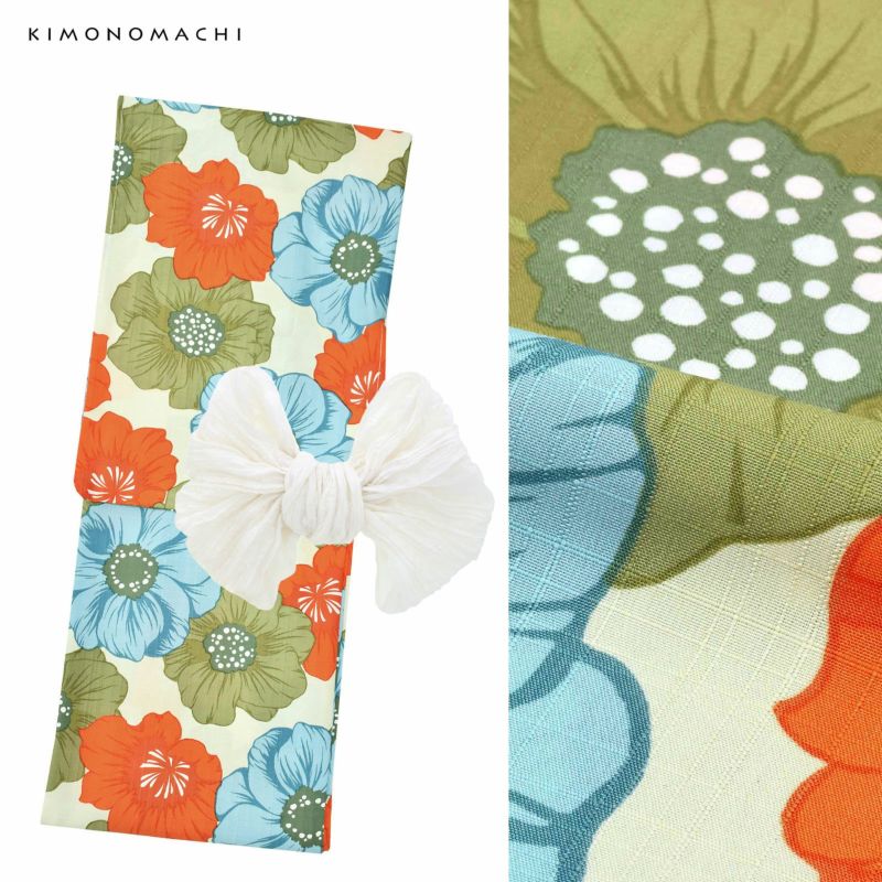 浴衣:ベージュみの淡い黄緑色の地に、淡いカーキグリーンやスモークブルー、橙色のポピーを散らしたデザインです。落ち着いた色遣いと大きな花々が大人かわいい印象です。