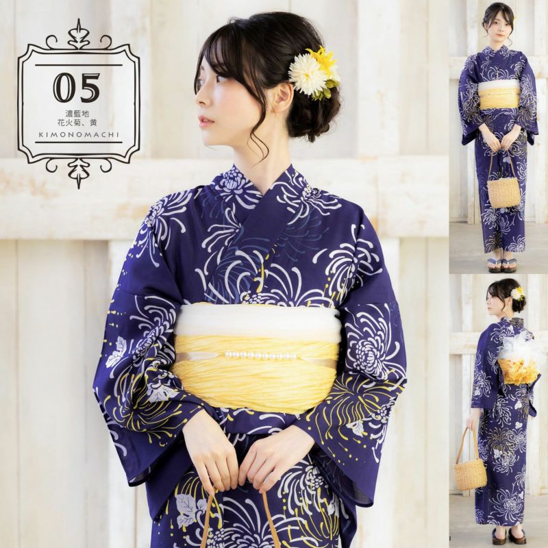 浴衣:青紫みの紺色の地。白抜きの管物の菊の合間に、冠菊の花火が開いています。花火の黄色や淡い青灰色が変化を与えています。