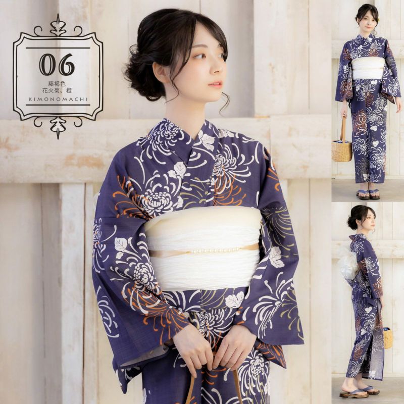 浴衣:やや鈍い灰みの藤色の地。白抜きの管物の菊の合間に、冠菊の花火が開いています。花火の橙色や淡い抹茶色が変化を与えています。