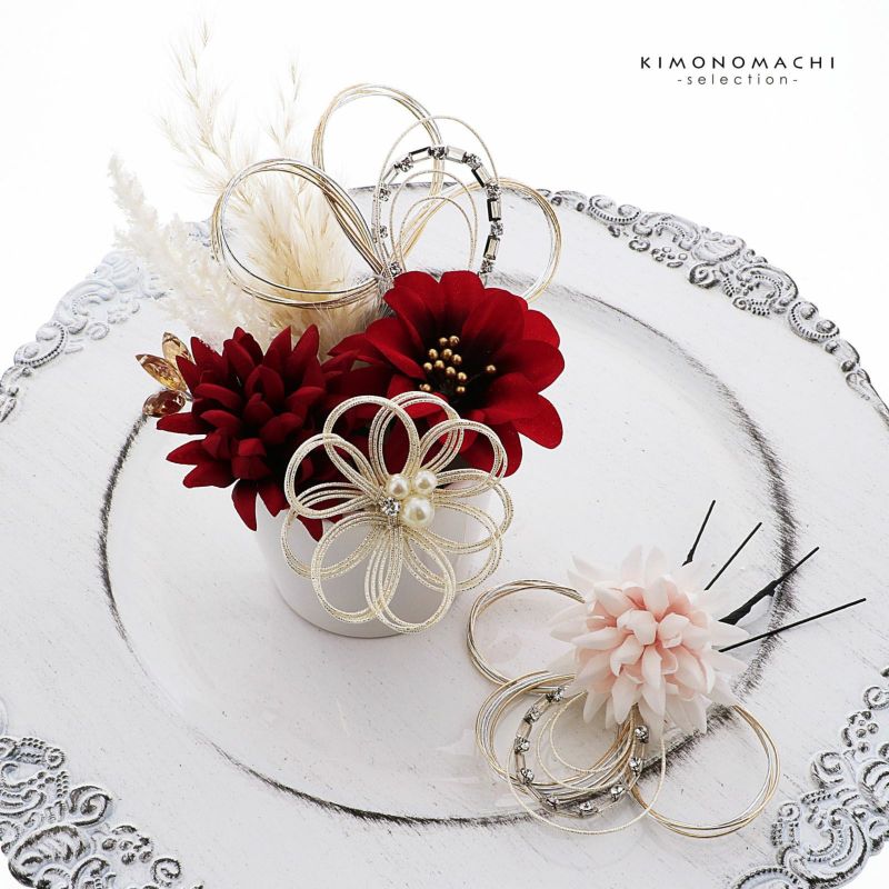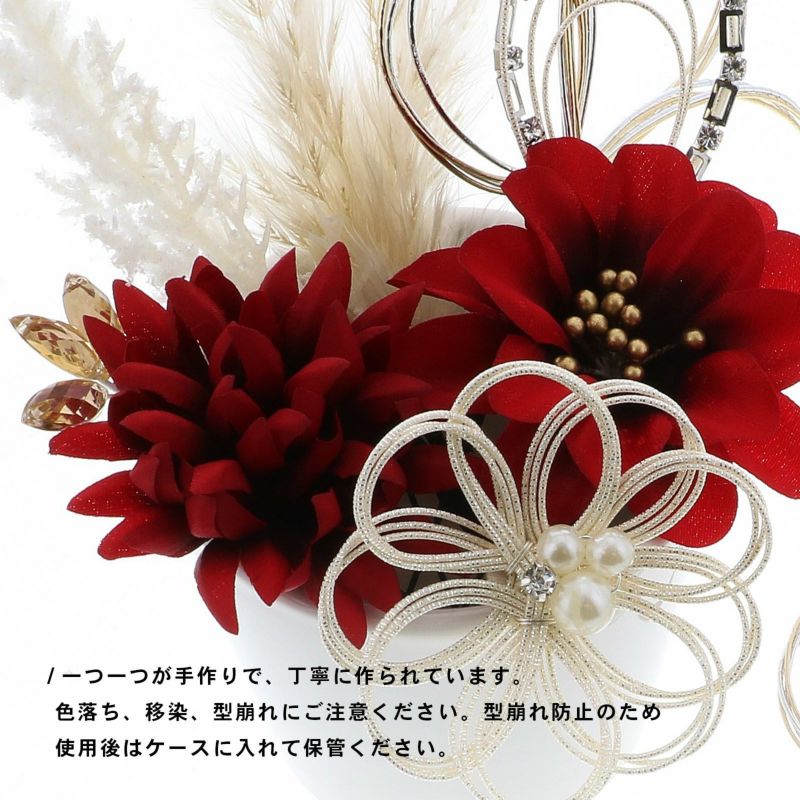 1.レッド お花とラインストーン水引:赤の花びらにゴールドペップのお花と、ホワイトゴールドの水引にラインストーンの輪を組み合わせたUピン1点。淡いピンクのマムとホワイトゴールドの水引にラインストーンの輪を組み合わせたUピン1点。深い赤のマムにアンバーのカットガラスを組み合わせたUピン1点。パールビーズとラインストーンにホワイトゴールドの水引のお花Uピン1点。金銀の水引の三つ輪飾りのUピン2点。白とベージュのパンパス、フェザーグラスのドライフラワーUピン1点。