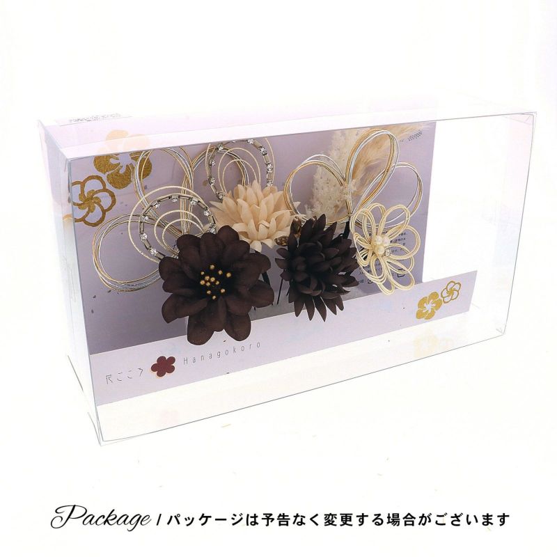 2.チャコール お花とラインストーン水引:チャコールの花びらにゴールドペップのお花と、ホワイトゴールドの水引にラインストーンの輪を組み合わせたUピン1点。アイボリーのマムとホワイトゴールドの水引にラインストーンの輪を組み合わせたUピン1点。チャコールのマムにアンバーのカットガラスを組み合わせたUピン1点。パールビーズとラインストーンにホワイトゴールドの水引のお花Uピン1点。金銀の水引の三つ輪飾りのUピン2点。白とベージュのパンパス、フェザーグラスのドライフラワーUピン1点。