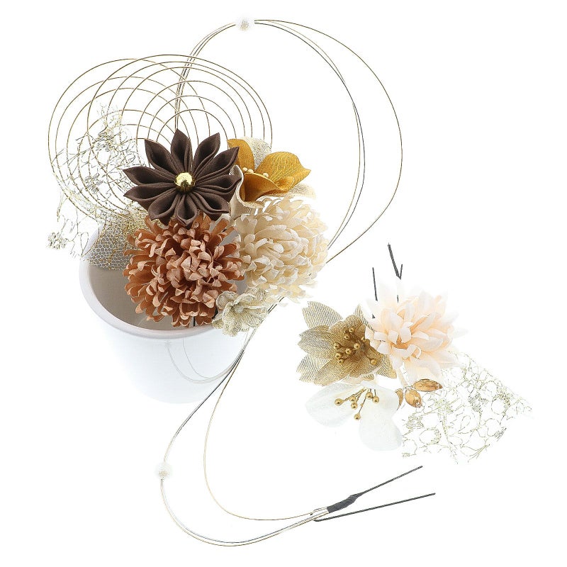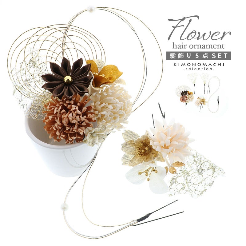 (卒業式応援75%SALE 2/19迄)成人式 髪飾り Uピンの5点セット「グレーベージュ 菊と八重桜、水引」日本製 振袖用髪飾り お花髪飾り 成人式 卒業式 結婚式 着物【メール便不可】