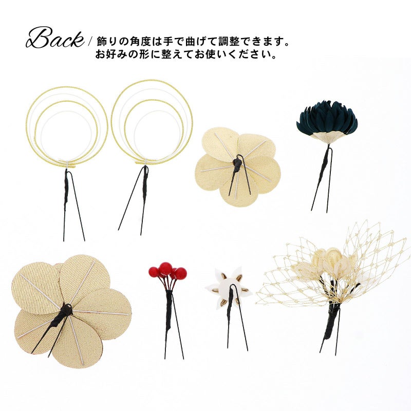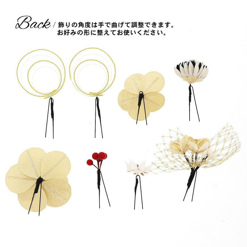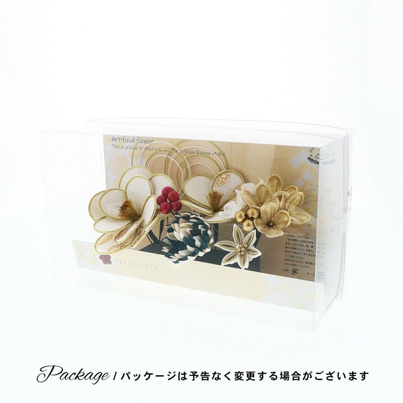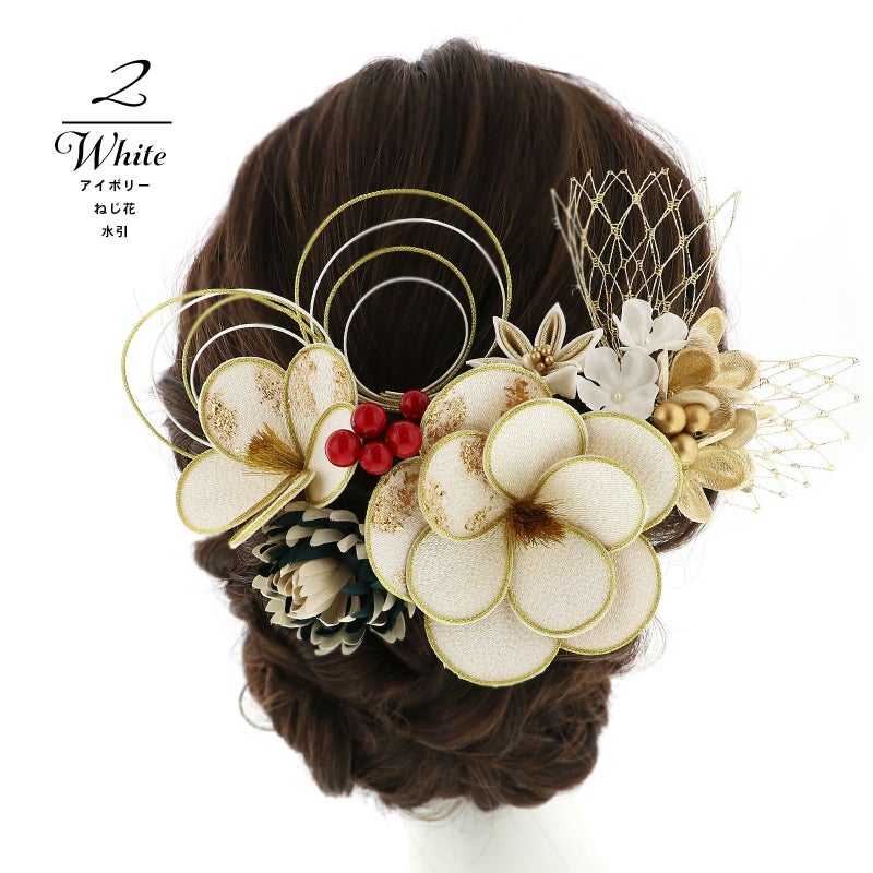 2アイボリー ねじ花、水引:アイボリーに金箔の入った縮緬地にゴールドの縁取りの平たい花びらのねじ花大小各1点。深緑とベージュの花びらのマムUピン1点。ゴールドと白の小花にゴールドビーズとチュールリボンを組み合わせたUピン1点。アイボリーとゴールドの二重剣つまみのお花のUピン1点。赤い実のUピン1点。アイボリーとゴールドの水引の輪飾り2点。