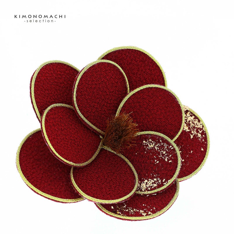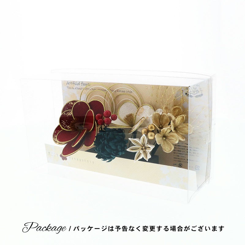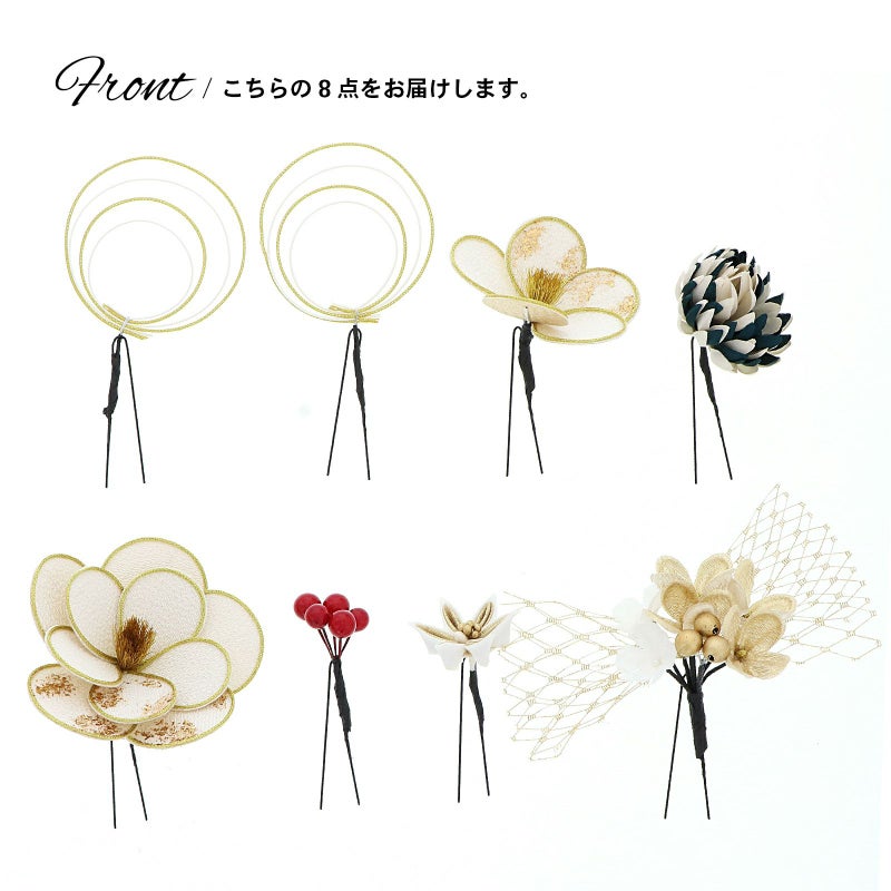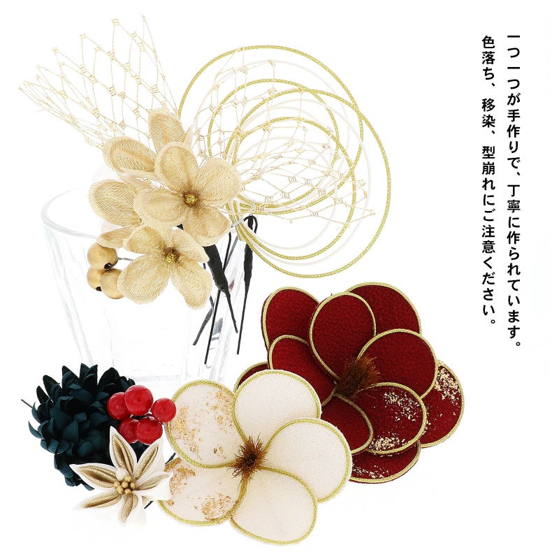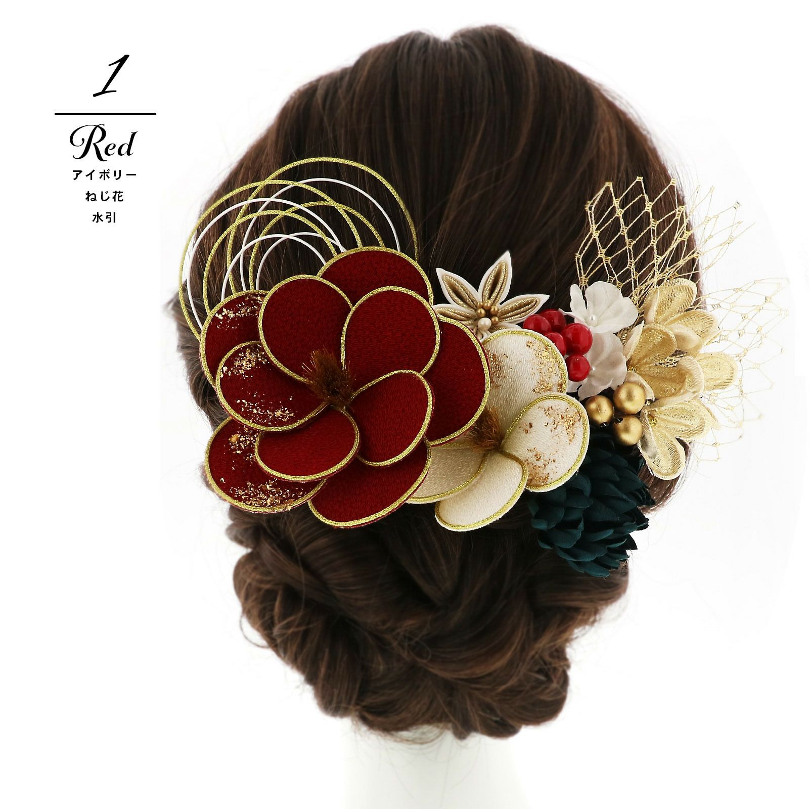 1.レッド、アイボリー ねじ花、水引:深い赤に金箔の入った縮緬地にゴールドの縁取りの平たい花びらのねじ花大1点、アイボリー地の小1点。深緑の花びらのマムUピン1点。ゴールドと白の小花にゴールドビーズとチュールリボンを組み合わせたUピン1点。アイボリーとゴールドの二重剣つまみのお花のUピン1点。赤い実のUピン1点。アイボリーとゴールドの水引の輪飾り2点。