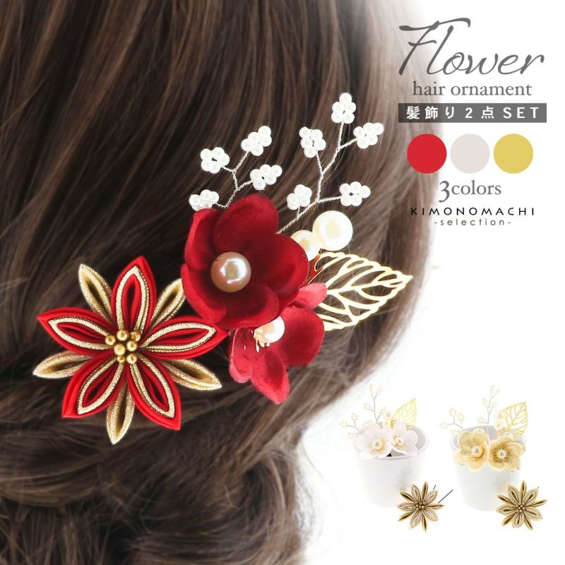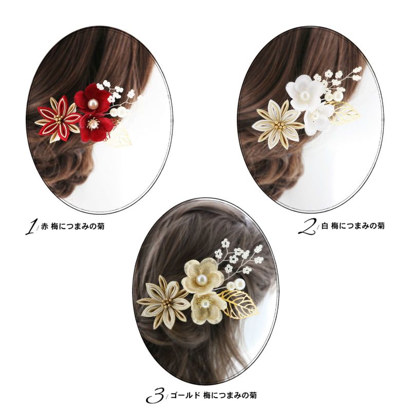 1.アカ 梅につまみの菊:深い赤の花びらにパールの蕊の梅2輪、白のビーズついた枝飾り、パールビーズにゴールドの透かしのメタルリーフのUピン1点。赤とゴールドの2重剣つまみの菊のUピン1点。