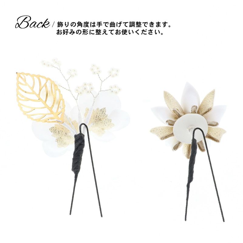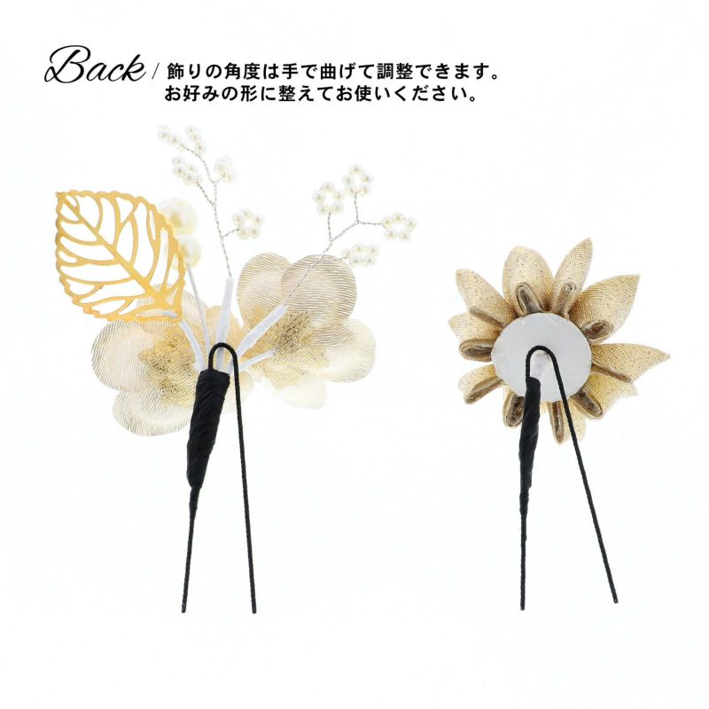 3.ゴールド 梅につまみの菊:ゴールドの花びらにパールの蕊の梅2輪、白のビーズついた枝飾り、パールビーズにゴールドの透かしのメタルリーフのUピン1点。ベージュとゴールドの2重剣つまみの菊のUピン1点。